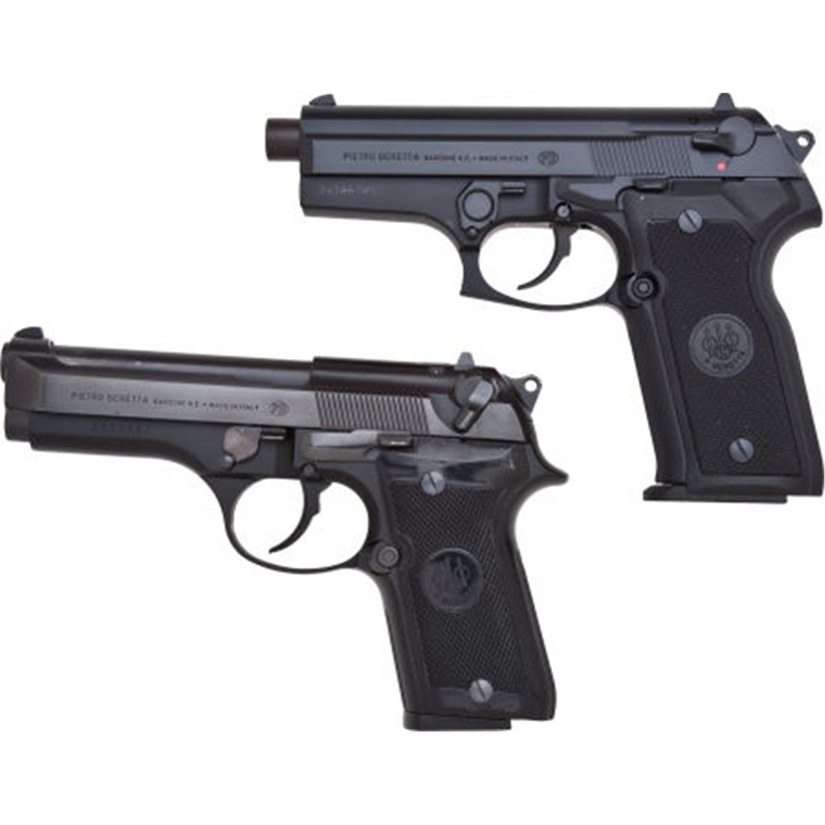 Beretta Lot (2) Model 8045 and 92 Compact .45 & 9mm Semi-Auto Pistols. (1) Serial no. 050861MC, .45 cal, 3.6 "" barrel, matt-black Bruniton finish, plastic grips, anodized alloy frame with steel slide, ambidextrous safety (de-cocking lever), 3-dot fixed sights, short recoil system with rotating barrel, comes with two-8 shot magazines, manual, cleaning brush & factory plastic case in Beretta cardboard box. MSR $860. (2) Serial no. C05388Z, 9mm, 4.3"" barrel, bright blue finish, plastic grips, all steel, ambidextrous safety, fixed sights, loaded chamber indicator, comes with one-14 shot magazine, in factory plastic case. MSR $620" Condition: As-New in factory boxes. Bores are bright, actions crisp. Not for sale where high-capacity mags are prohibited. NRA FIREARMS FOR FREEDOM PROGRAM