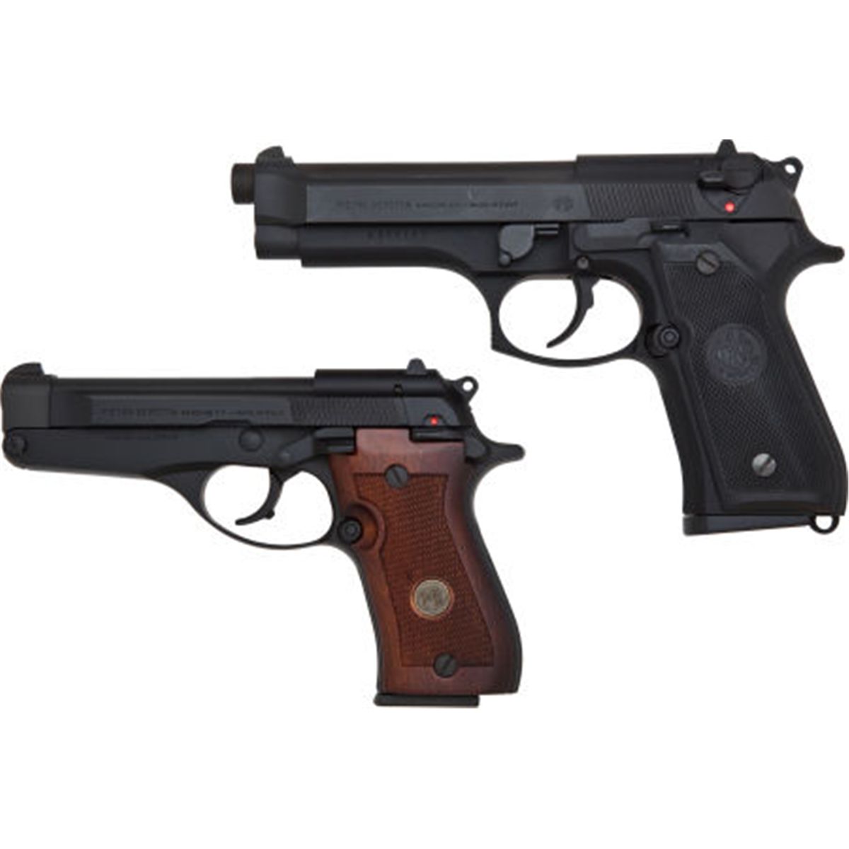 Beretta Lot - Models 86B .380 & 92F 9mm Semi-Automatic Pistols. (1) Serial no. G00017Y, .380 ACP, 4.4" tip-up barrel, matte black bruniton finish, checkered wood grips, alloy frame with steel slide, ambidextrous safety (decocking lever), low profile 3-dot sight, with two 8-shot magazines, manual, cleaning brush and factory plastic case, in Beretta cardboard box. (2) Serial no. K00019Z, 9mm, 4.9"" barrel, matte black bruniton finish, plastic grips, alloy frame with steel slide, ambidextrous safety (decocking lever), fixed sights, loaded chamber indicator, with two 15-shot magazines, manual, cleaning brush and factory plastic case, in Beretta cardboard box. Condition: Both are as new in factory boxes. Bores are bright, actions are strong.NRA FIREARMS FOR FREEDOM PROGRAM