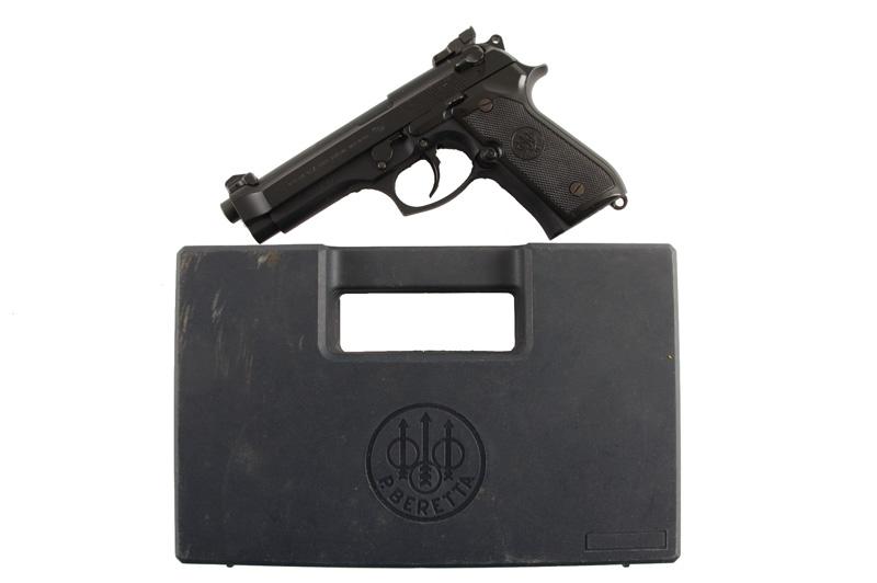 Condition: Perfect and may not haveDouble action semi auto commercial pistol. Matte black finish, black checkered grips with Beretta logo molded in, 5" open top barrel with adjustable sights, good bore and action. Condition: Perfect and may not have been fired.Included in dark blue plastic carry case with cleaning rod but NO MAGAZINE.