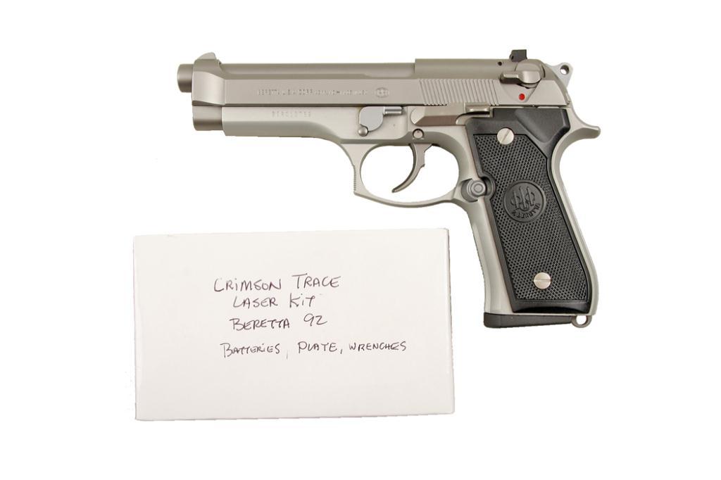 Beretta Mdl 92FS Cal 9mm SN:BER013769 DA/SA semi-auto pistol with Crimson Trace laser grip kit installed. SS barrel & slide, aluminum alloy frame, black rubber checkered Crimson Trace grips, 5" barrel, three white dot Trijicon adjustable sights, good borDA/SA semi-auto pistol with Crimson Trace laser grip kit installed. SS barrel & slide, aluminum alloy frame, black rubber checkered Crimson Trace grips, 5" barrel, three white dot Trijicon adjustable sights, good bore and action. Includesoriginal box numbered to the gun, extra set of grips, and carry case. Condition: Excellent including working laser grips with instructions, extra battery and tools, and 2 magazines.