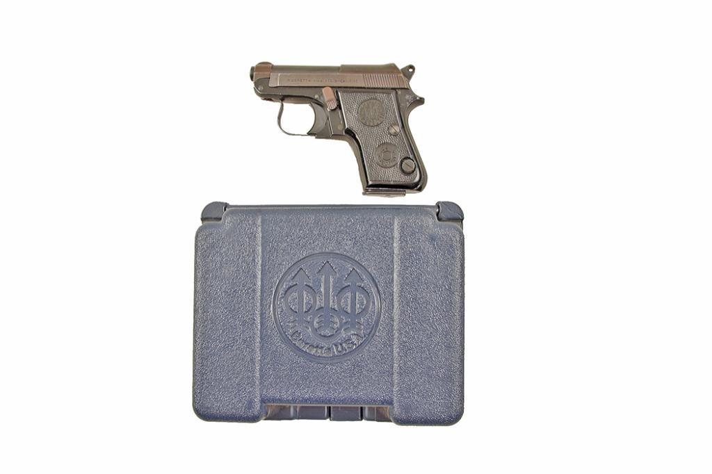 Beretta Mdl 950 B Jetfire Cal .32auto SN:885100, Double action semi-auto pistol made in Italy with front pivoting pop up barrel. Matte blued finish, black plastic checkered grips, 2 1/2" barrel, fixed sights, good bore and action. Condition: Near excSN:885100, Double action semi-auto pistol made in Italy with front pivoting pop up barrel. Matte blued finish, black plastic checkered grips, 2 1/2" barrel, fixed sights, good bore and action. Condition: Near excellent and shows little use.Included in blue plastic carry case with instruction manual.