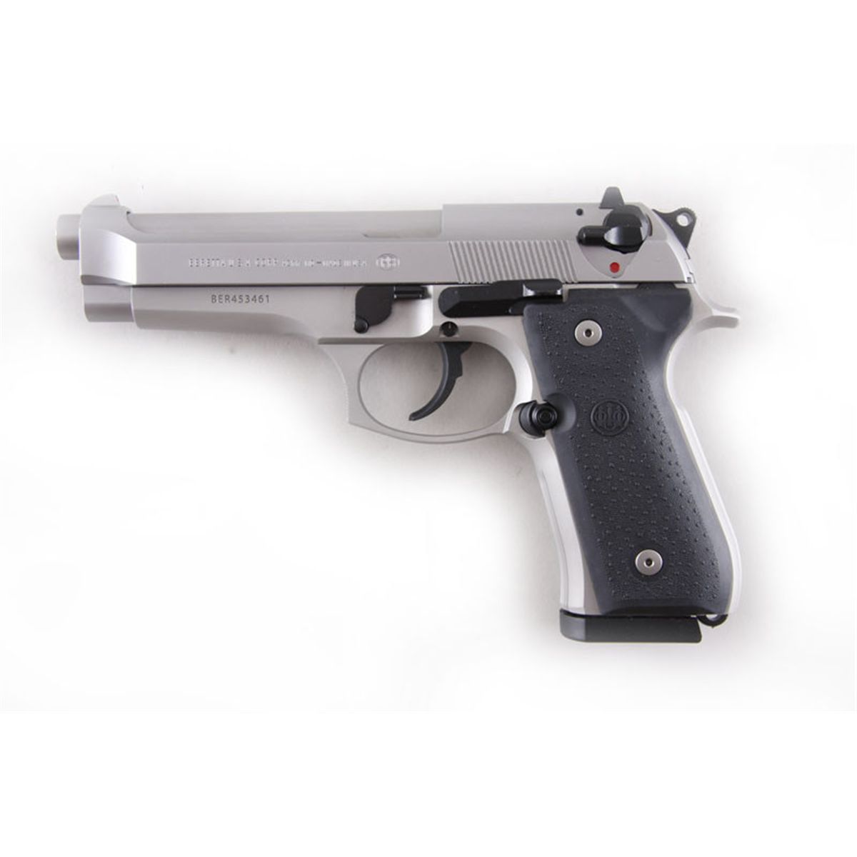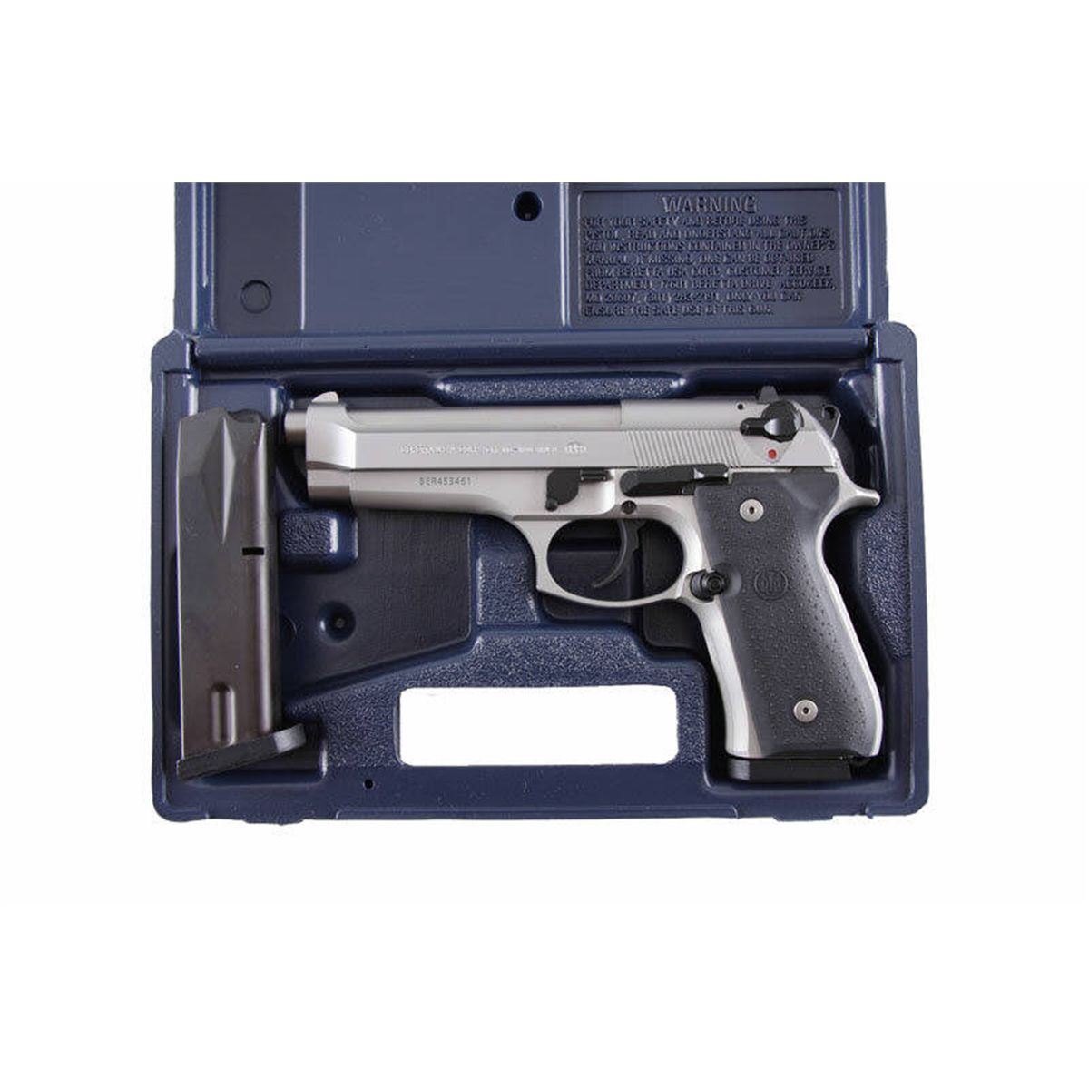 Beretta Mdl 96FS Cal .40S&W SN:BER453461 Double action semi-auto pistol made in U.S.A.. Stainless steel slide with open top, aluminum alloy frame, black pebbled grip panels, 4 3/4" barrel with 3 red dot drift adjustable sights, ambidextrous safety/decocDouble action semi-auto pistol made in U.S.A.. Stainless steel slide with open top, aluminum alloy frame, black pebbled grip panels, 4 3/4" barrel with 3 red dot drift adjustable sights, ambidextroussafety/decocker, good bore and action. Included in blued plastic carry case with instructions, gun lock, and instruction manual. Condition: Near new with no sign of use. 2magazines.
