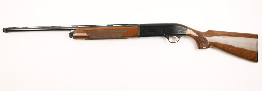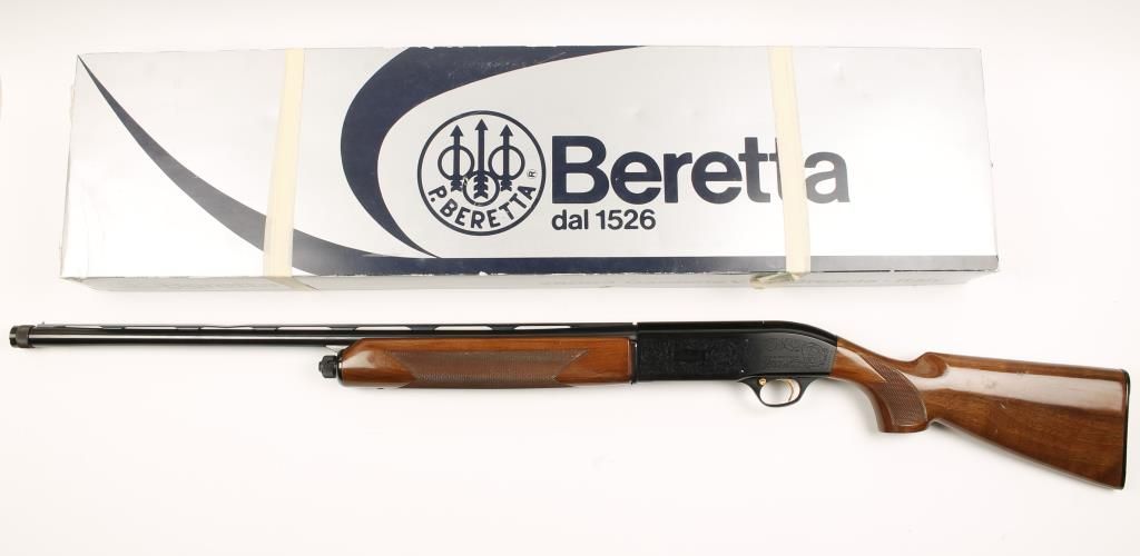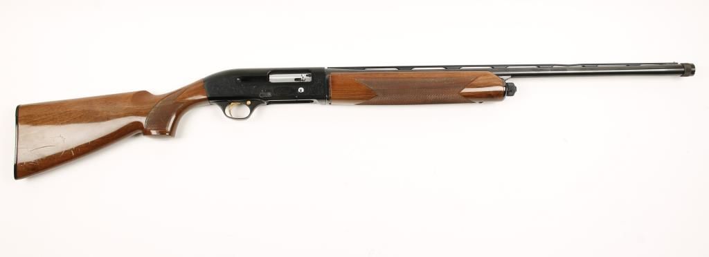 Italian made semi auto shotgun with 26" vent rib barrel with screw in chokes. Blued finish, scroll engraved receiver, checkered pistol grip walnut stock and forend. Good bore and action. Includes original box, manual, 3 chokes and choke wrench. Condition: Good overall showing mishandling scratches near butt an drib is bent about 8" from muzzle. *Modern Firearm*
