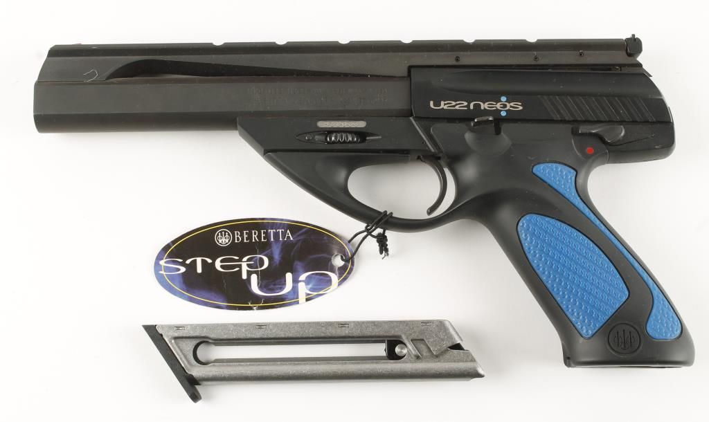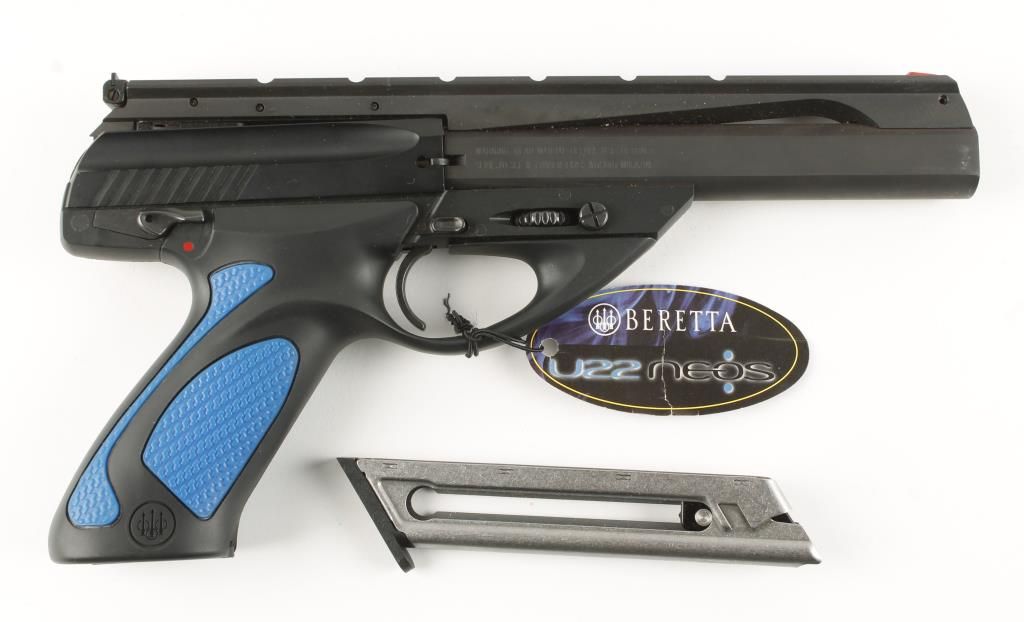 Single action semi auto target pistol with 6" barrel. Matte blue finish, polymer frame and grip with blue inserts, red front sight, adjustable rear sight and integral scope rail. Excellent bore and action. Includes original box, manual and (2) magazines. Condition: Near perfect *Modern Firearm*