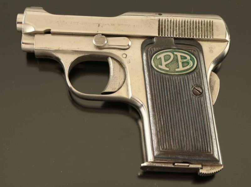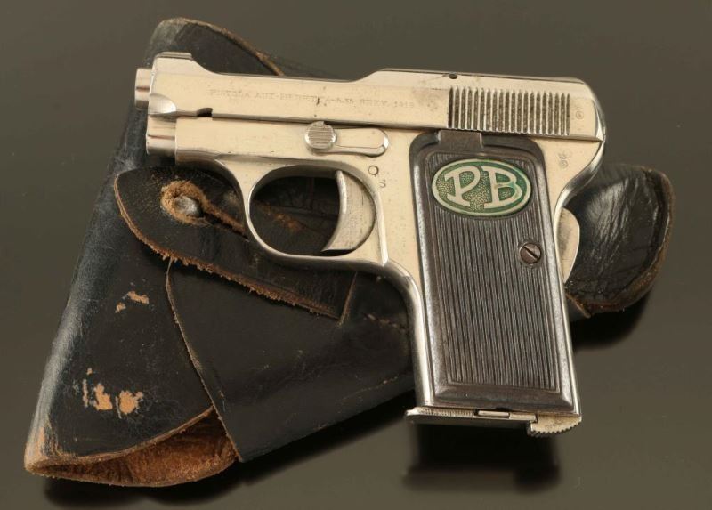 Semi-automatic nickel plated pistol, in .25acp,21/2"BBL, with black leather holster, bore is dark and pitted. NRA Fair Modern Firearm