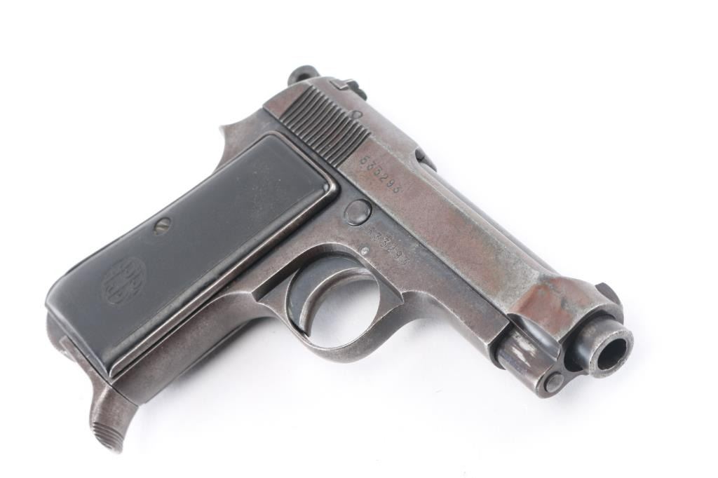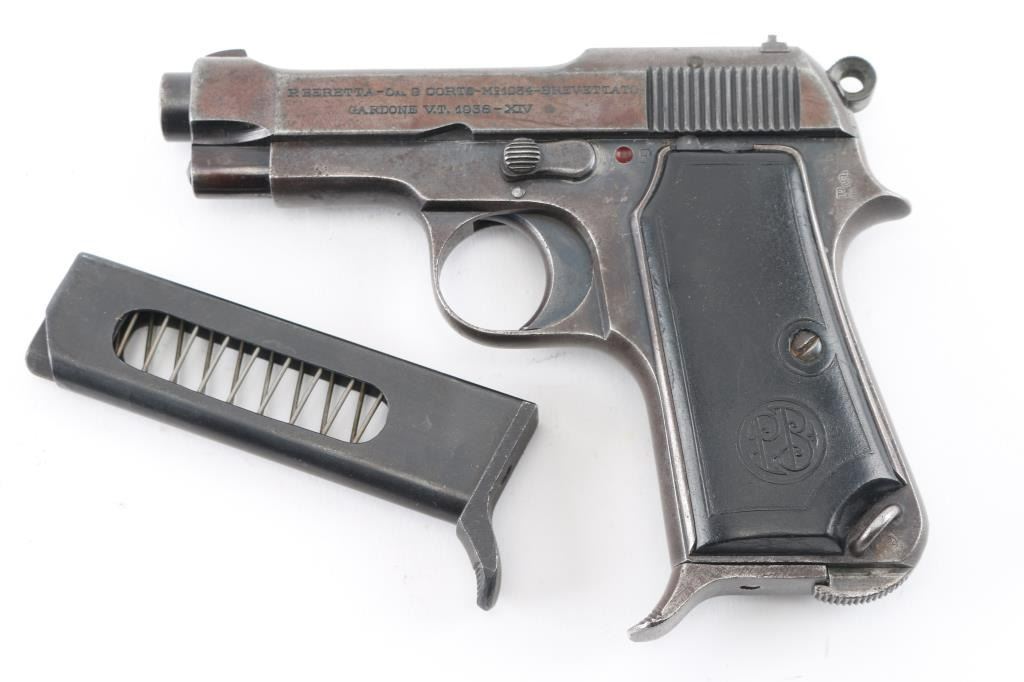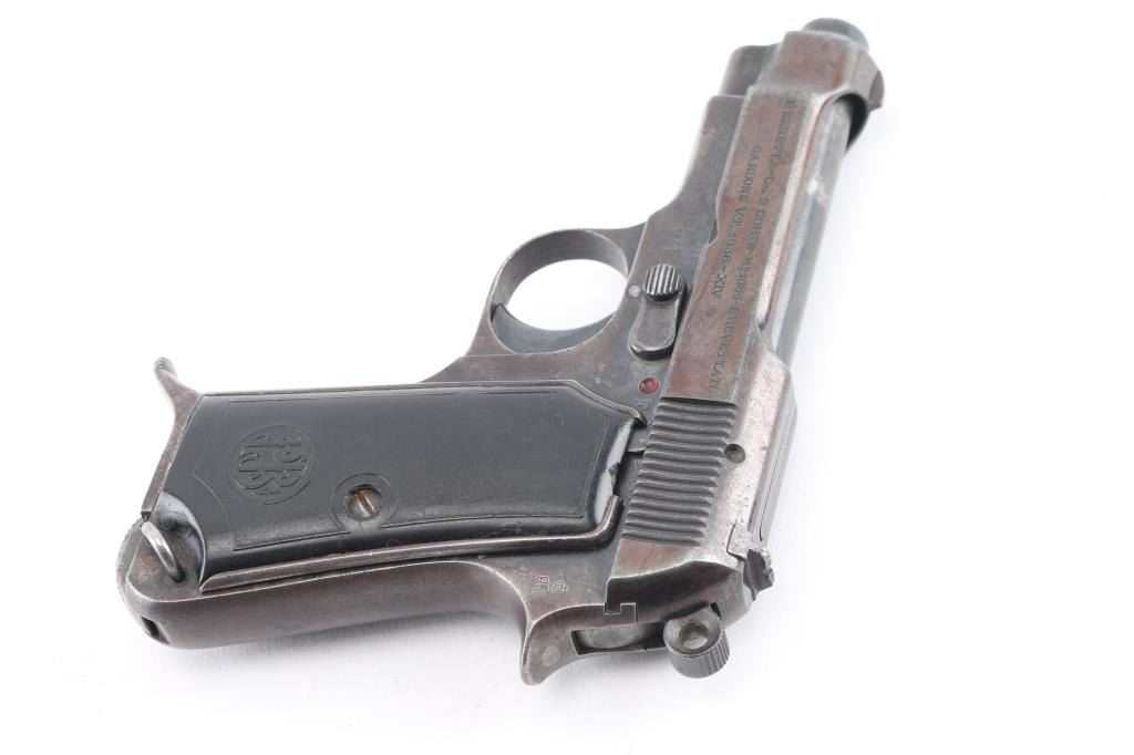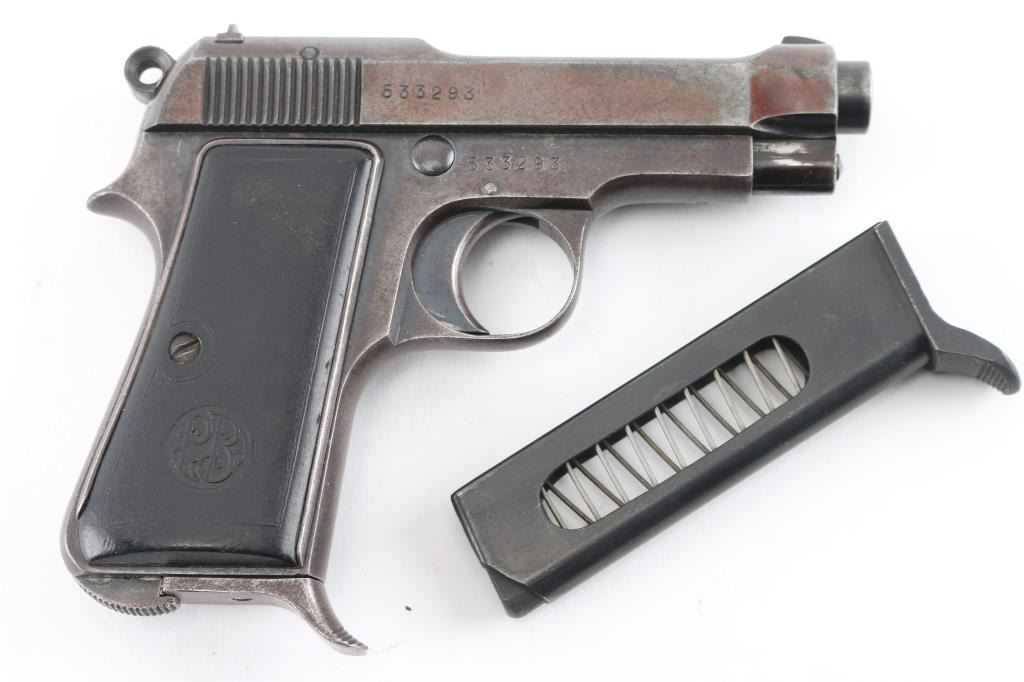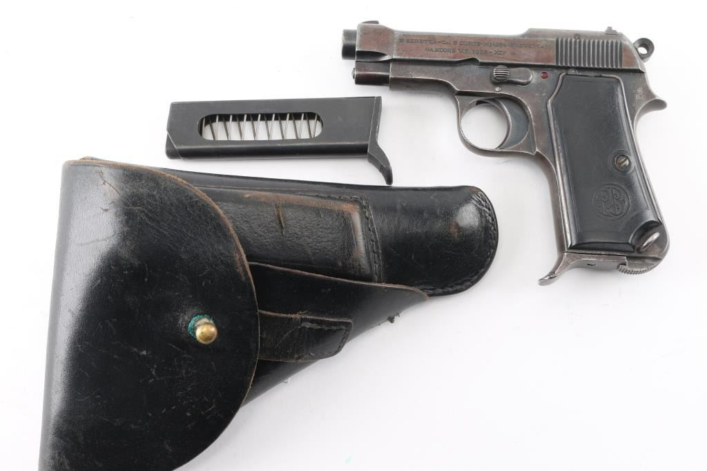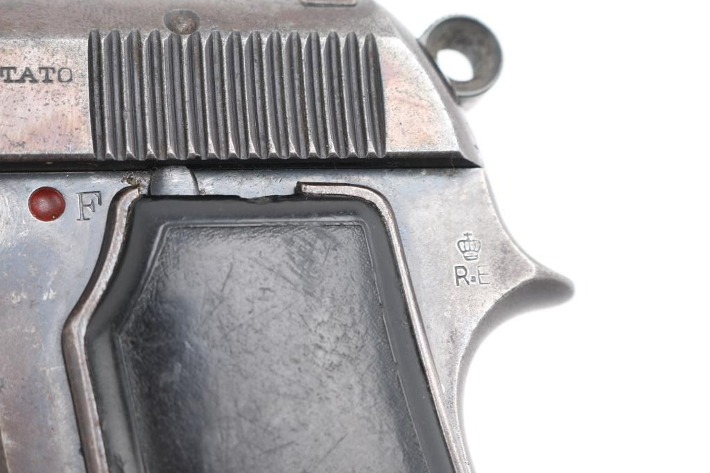 WWII Italian military single action semi-automatic service pistol chambered in .380, dated 1936. This model of pistol was used by all branches of the Italian Military, this one in particular is marked "RE" with Crown indicates it's use by the army. Features a blued finish, 3.4" barrel, fixed blade front sight, dovetailed square notched rear sight, smooth trigger, serrated round hammer spur, manual safety/slide stop, heel magazine release, 7 round magazine with finger rest floorplate, steel frame with lanyard loop on the left side, and lightly textured two-piece black hard rubber grips with "PB" monograms. Serial numbers match on the frame & slide. Bore is very good condition. Dark bluing on frame covers 40% of surfaces with edge losses, fading on grip straps, scattered small areas of pitting. Grips are good with wear. Includes black full flap leather military holster, good condition, pouch for spare magazine , extra magazine with finger rest included. Condition is NRA Good. C&R Firearm.