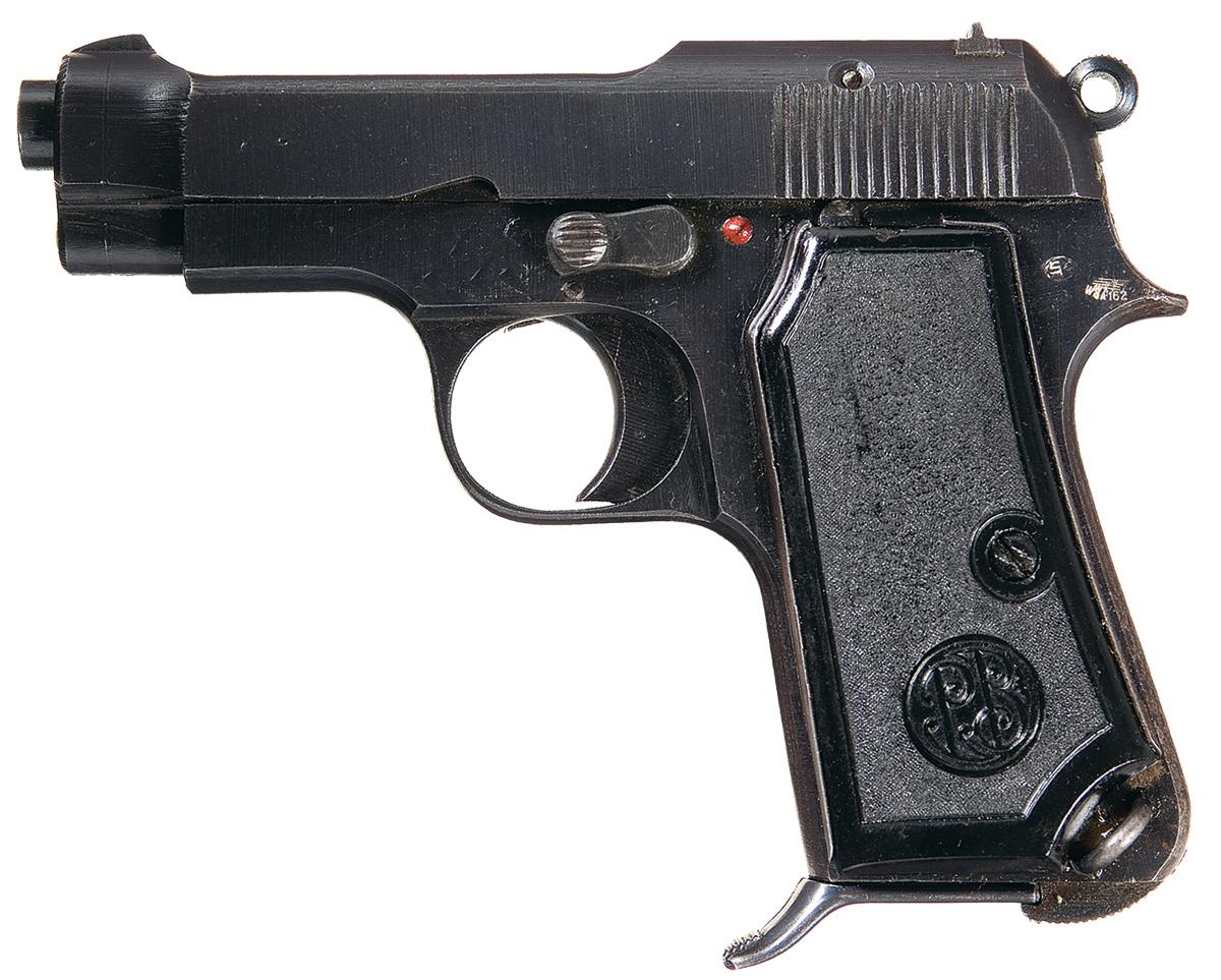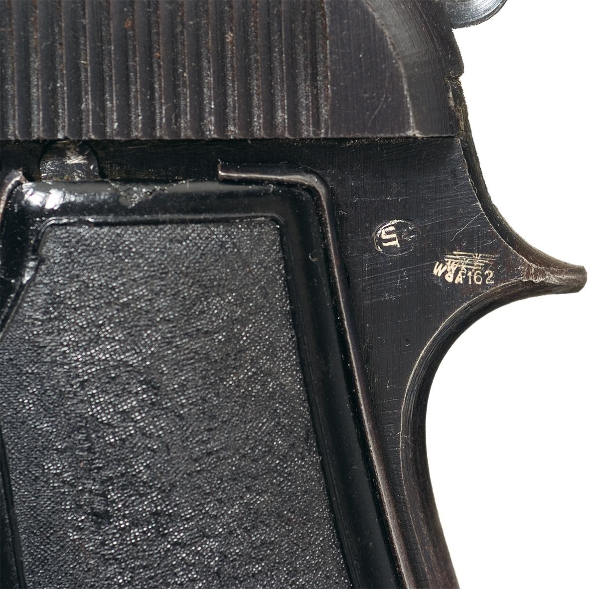 The left grip tang on this Beretta Model 1935 semi-automatic pistol is stamped with the "4/UT" inspection marking (Italian 4th Technical Service) and the rarely seen "eagle/WaA162" German Army acceptance proof. After the Italian government entered into the September 1943 armistice with Western allies, the German acceptance proof was applied to Model 1935 pistols produced by the German captured Beretta factory in Gardone. The slide of this pistol is without the legend, indicating that the pistol was manufactured circa 1945. The pistol is fitted with the standard metal backed black plastic grips with "PB" emblem and has the late war blue finish. The right side of the frame has the serial number and caliber marking ("CAL 7.65"). In Jan Still's book "Axis Pistols", Vol. II (page 107), the serial number of this pistol is not listed as being one of the 19 reported Model 1935 pistols stamped with the rare German Army acceptance proof, but matches some of the other pistols in features.
