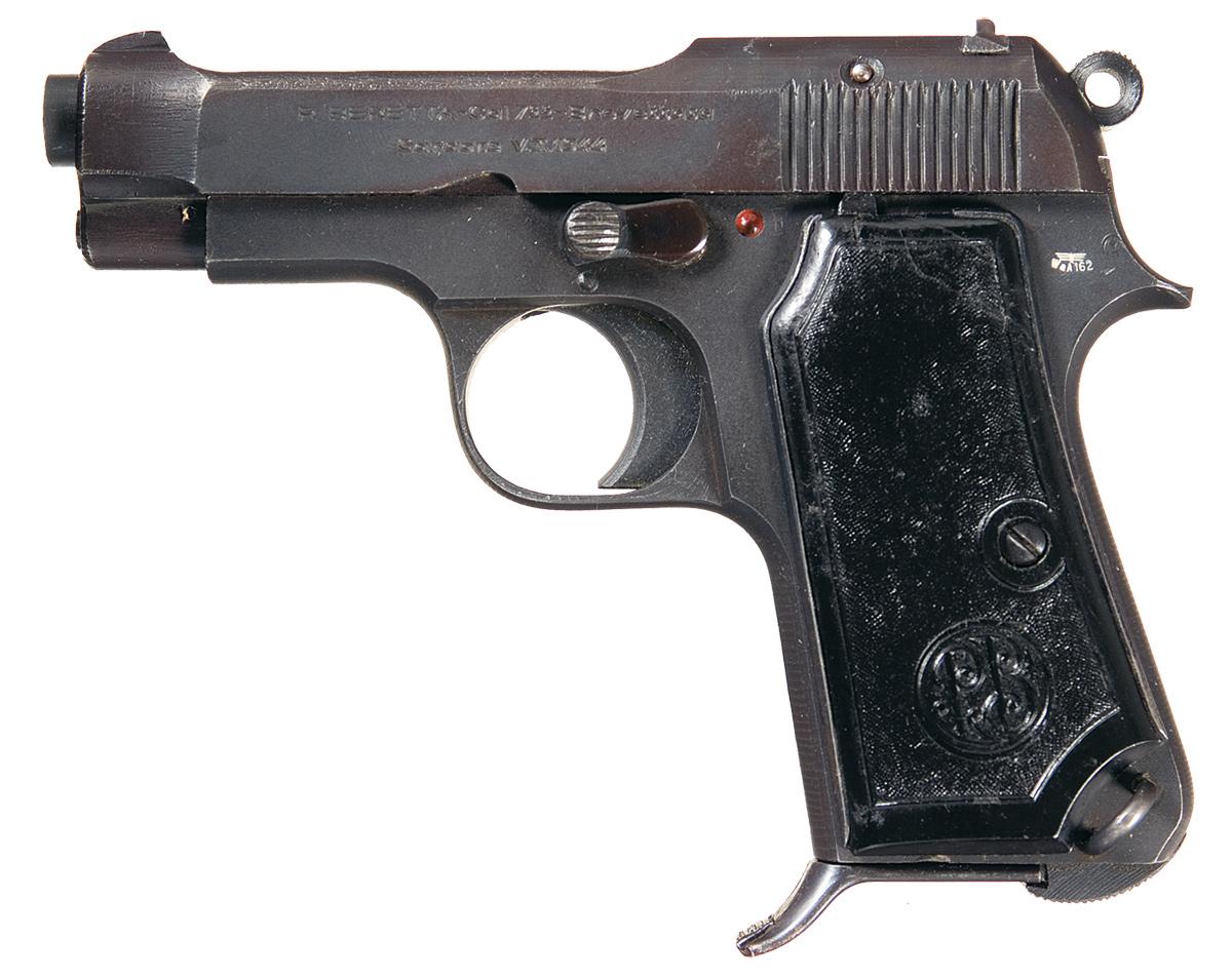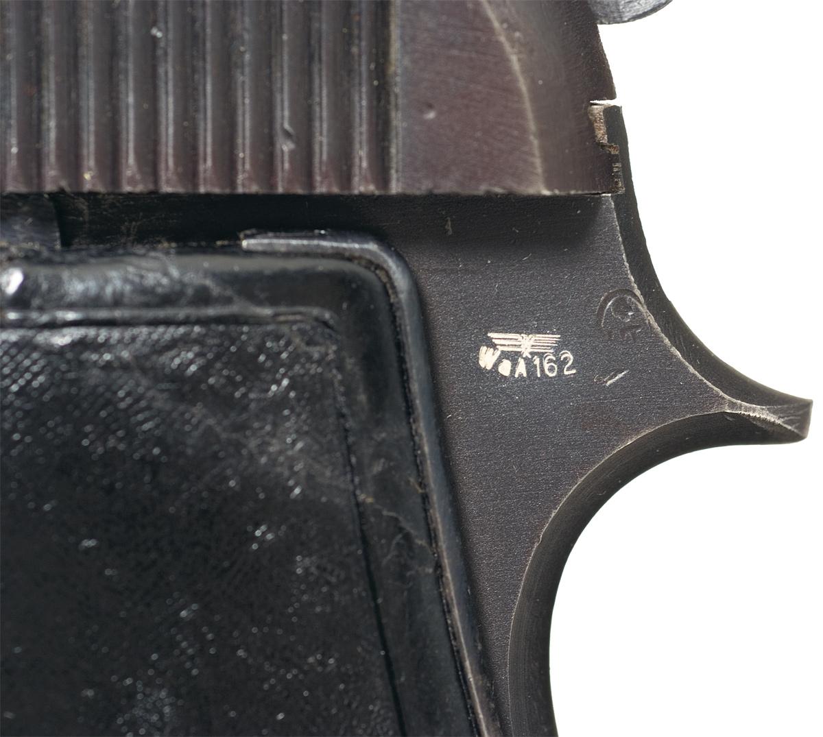 The left grip tang on this Beretta Model 1935 semi-automatic pistol is stamped with the 4/UT inspection marking (Italian 4th Technical Service) and the rarely seen eagle/WaA162 Nazi Army acceptance proof. After the Italian government entered into the September 1943 armistice with Western allies, the Nazi acceptance proof was applied to Model 1935 pistols produced by the captured Beretta factory in Gardone. The left side of the slide is marked "P. BERETTA-CAL. 7.65-Brevettata / Gardone V.T. 1944" (correctly without the Italian Fascist date). The pistol is fitted with the standard metal backed black plastic grips with "PB" emblem and has the late war phosphate finish. Matching serial number on slide and frame. In Jan Still's book "AXIS PISTOLS", Vol. II (page 107), the serial number of this pistol is not listed as being one of the 19 reported Model 1935 pistols stamped with the rare German Army acceptance proof, but has the same characteristics as some of the other reported examples which are all over the board in serial range.