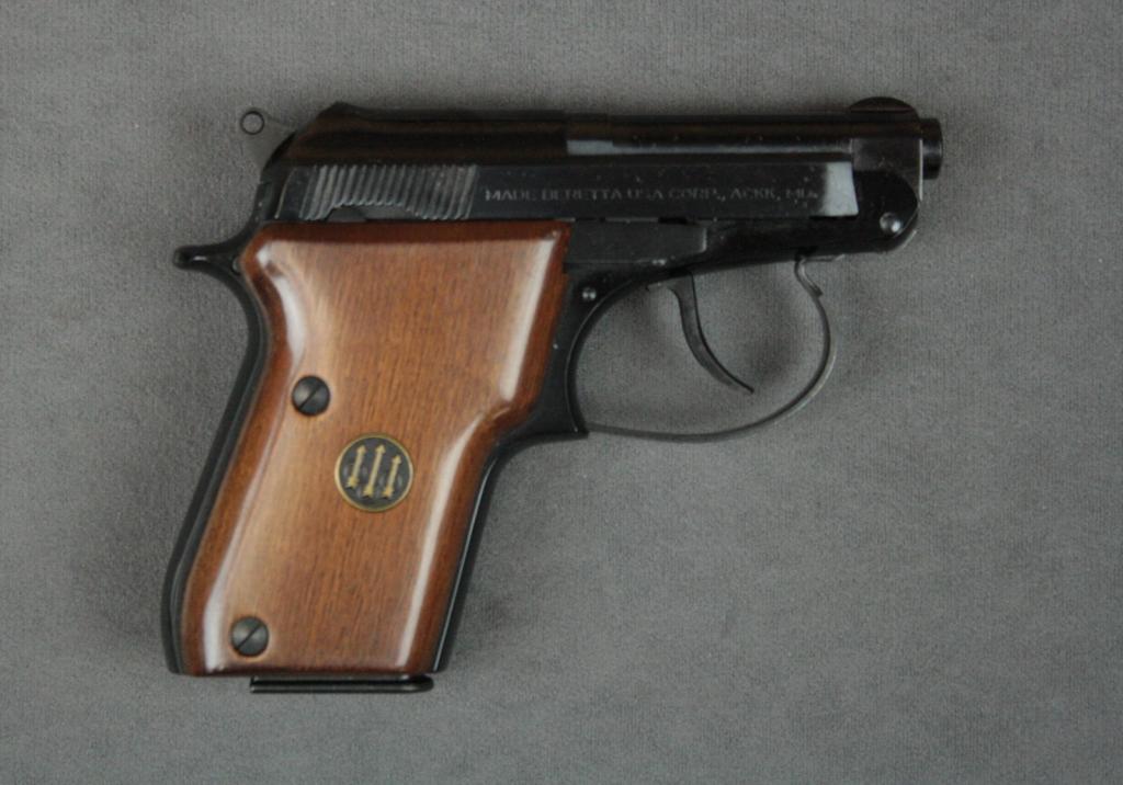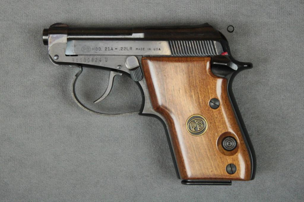 Beretta Model 21A DA magazine pistol, .22LR cal., 2-1/2” flip up barrel, black finish, medallion smooth wood grips, #BAS00824 U. This gun is in overall excellent condition showing approx. 99% original finish,excellent bore, action, markings and grips. Est.: $150-$300.