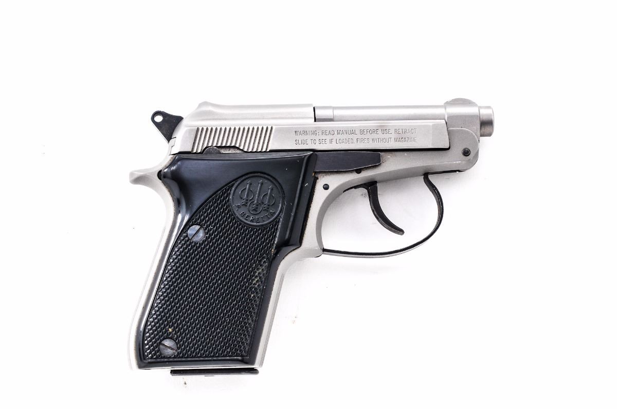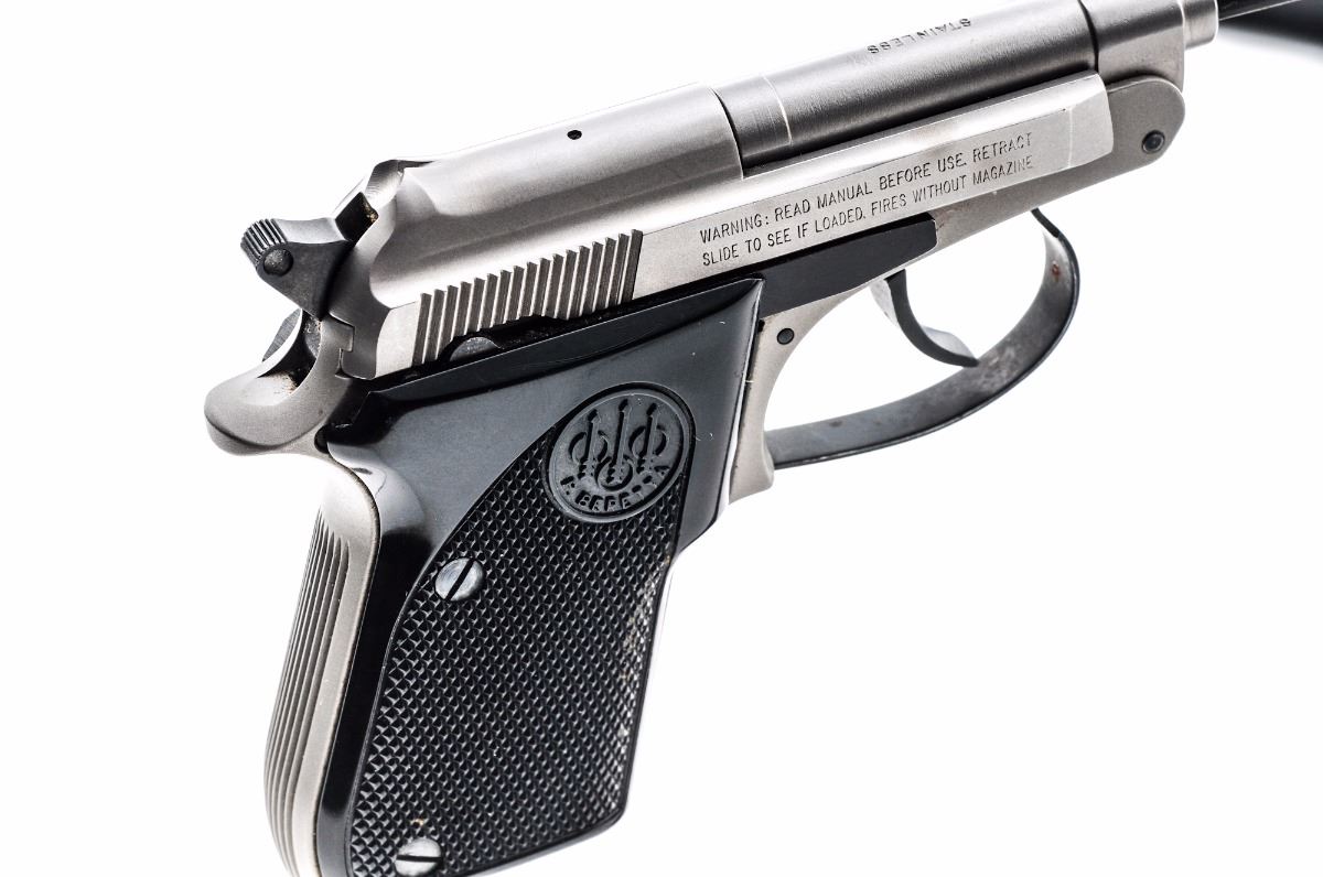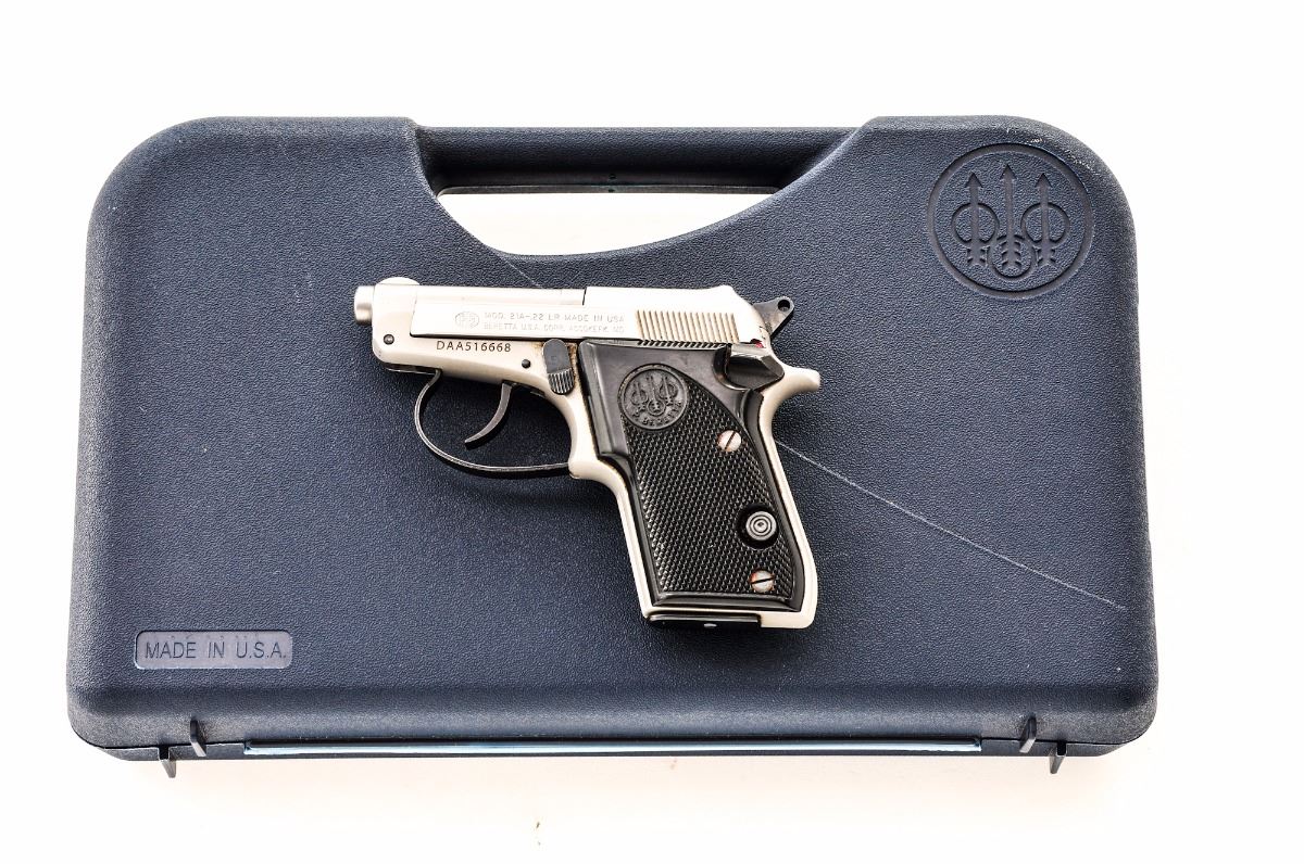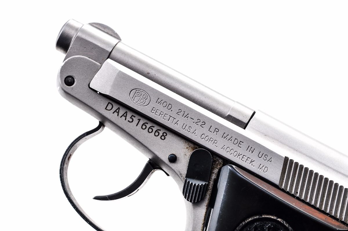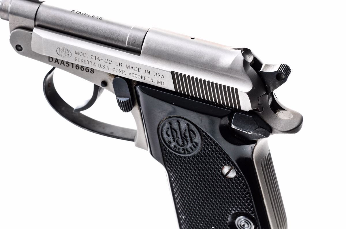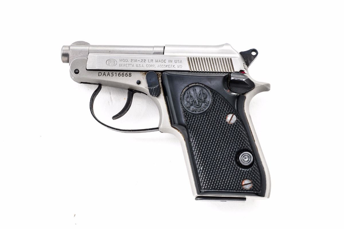 Beretta Model 21A Semi-Automatic Pistol, #DAA516668, .22 LR cal., 2.5'' barrel, stainless steel finish, checkered black plastic grips, blade front sight and ''V''-notch rear sight, with one blued magazine. In original case with gun lock. Condition is excellent, appearing near new. Est.: $300-$500. (Modern) (Not available to Calif. residents.)
