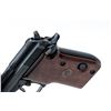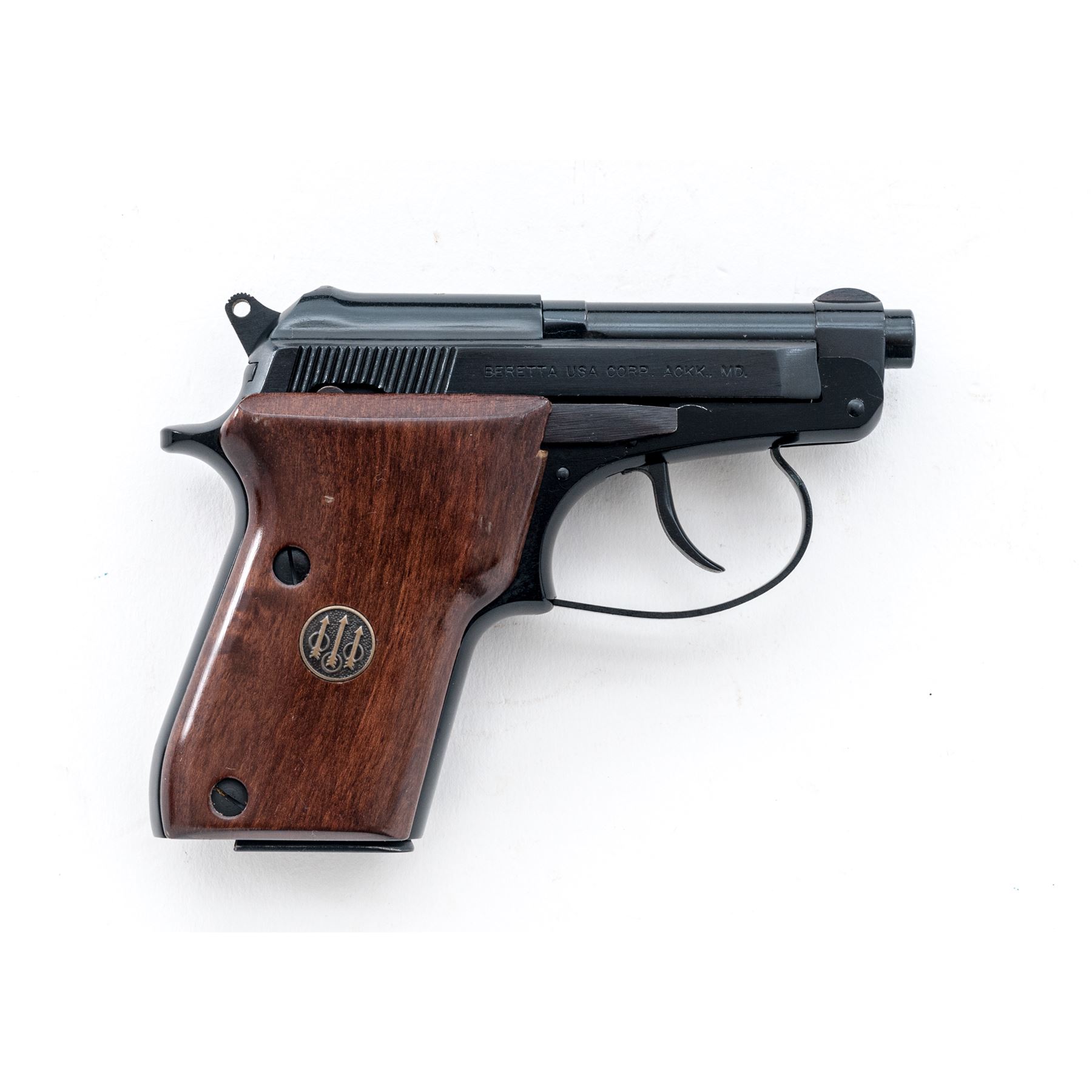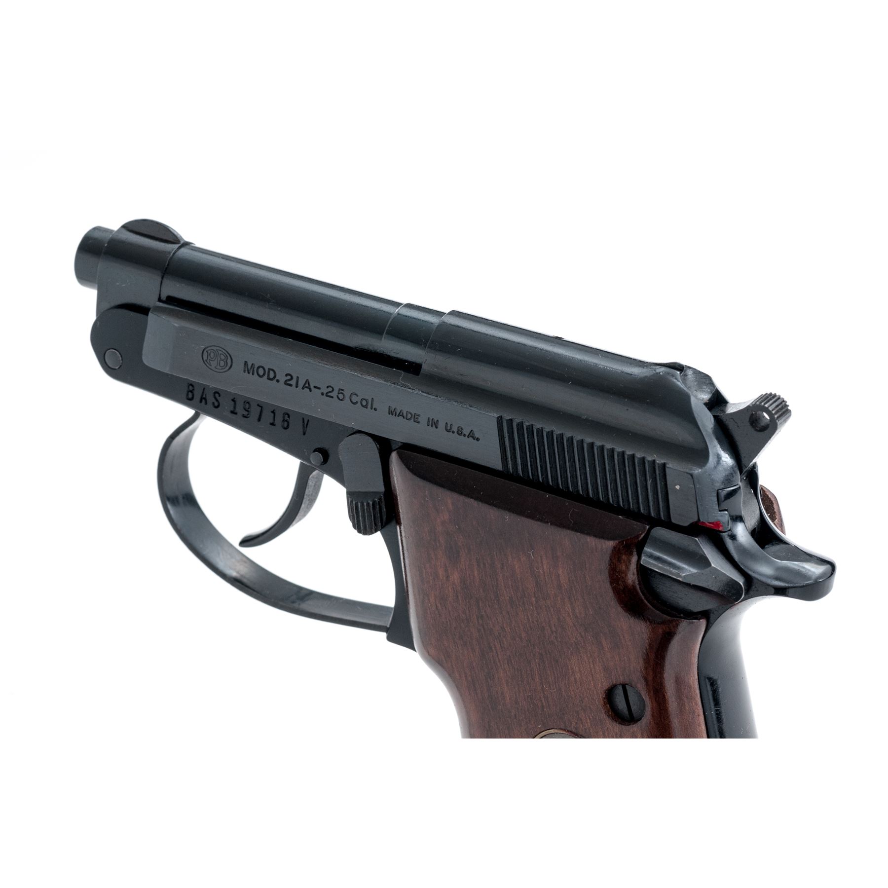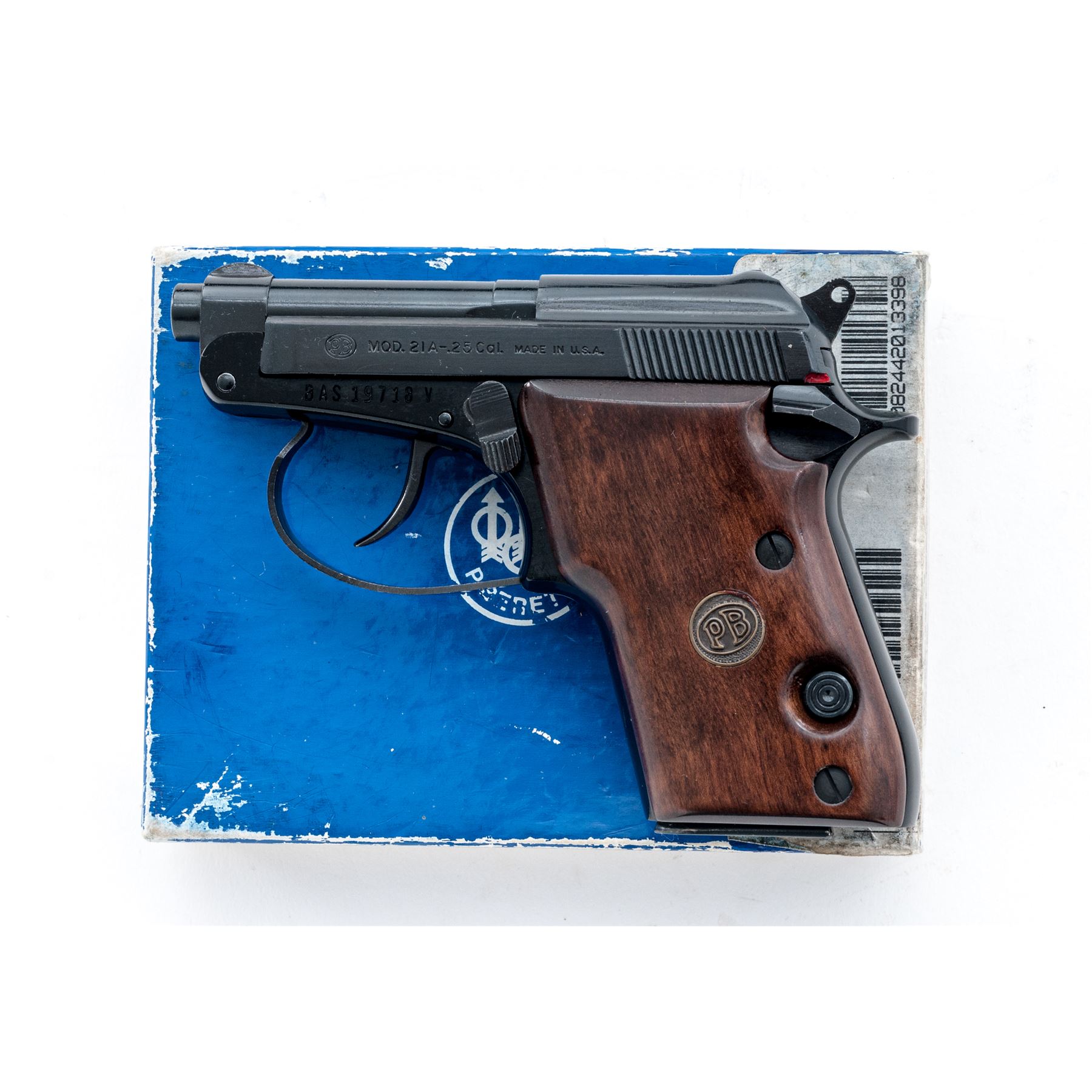 Beretta Model 21A Semi-Automatic Pistol, #BAS19718V, .25 ACP cal., 2.5'' tip-up barrel, alloy frame, blue finish, smooth wood grips with Beretta medallions, standard fixed sights, with one magazine. In original box with matching end label, owner's manual, and cleaning brush. Condition is excellent with approx. 98%+ original blue finish. Grips with a few intermittent small marks from handling. Action and bore are both excellent. Box shows moderate storage type wear, end label is clear. Est.: $200-$300. (Modern/PPT) (Consecutive to the Previous Lot)