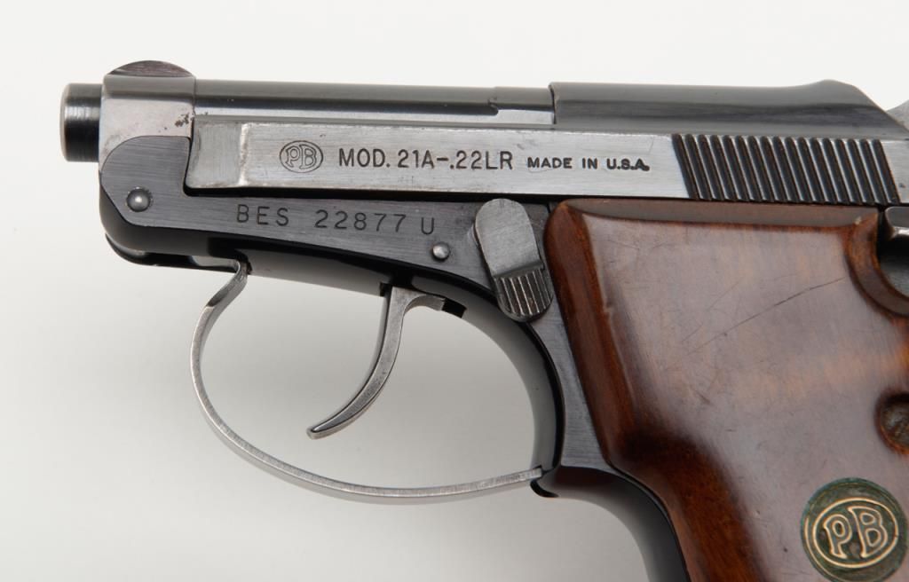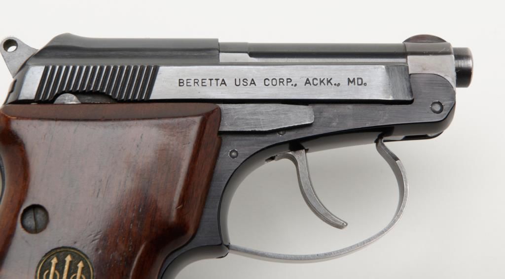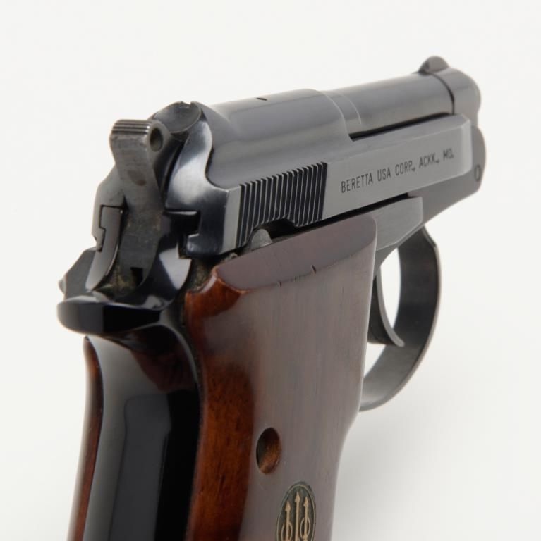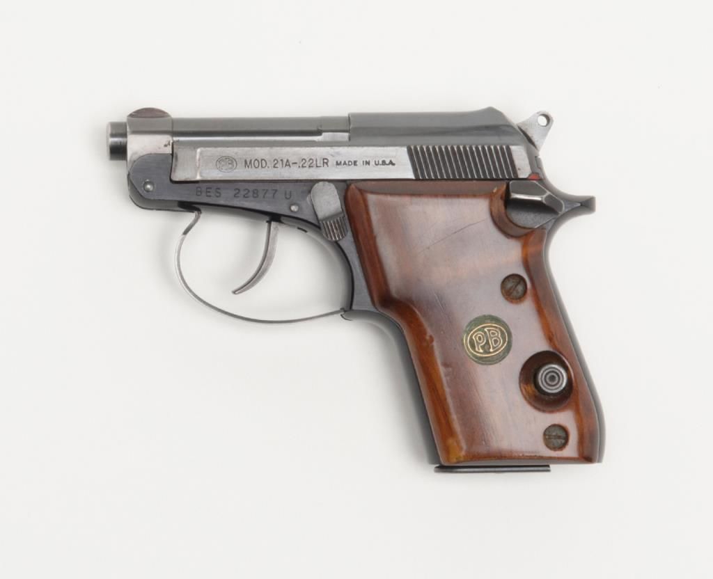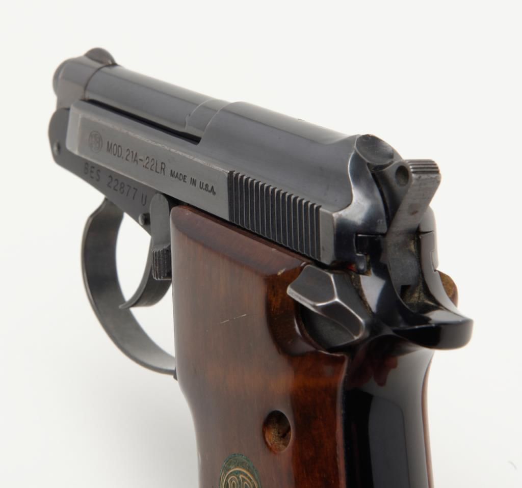 Beretta Model 21A, semi-automatic pistol, cal. .22 LR, Serial #22877U. The pistol is in overall good condition with a 2 1/2" barrel. The pistol retains the majority of its blued finish with some loss at the muzzle and along the slide. Thesmooth wood medallion grips are in good condition with some mars and bruising consistent with use. The bore is good and may well clean. The action is tight and marks clear, the pistol comes with one magazine. (Modern/PPT). Est.: $150-$300
