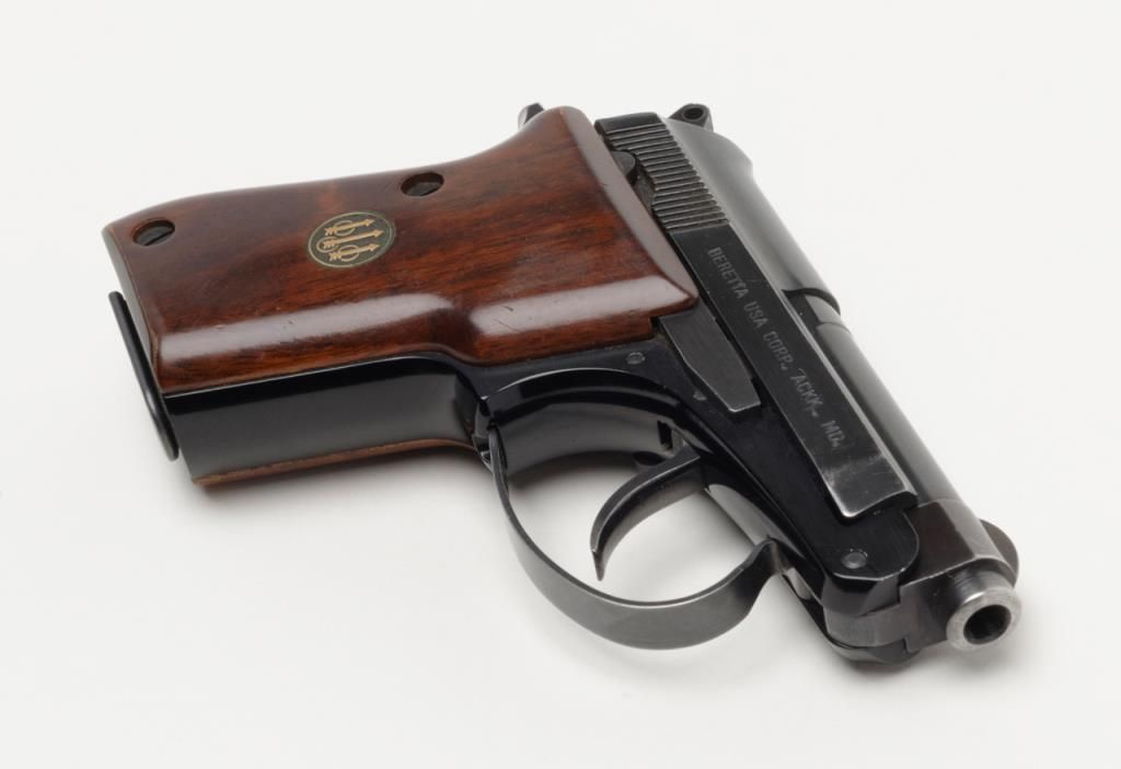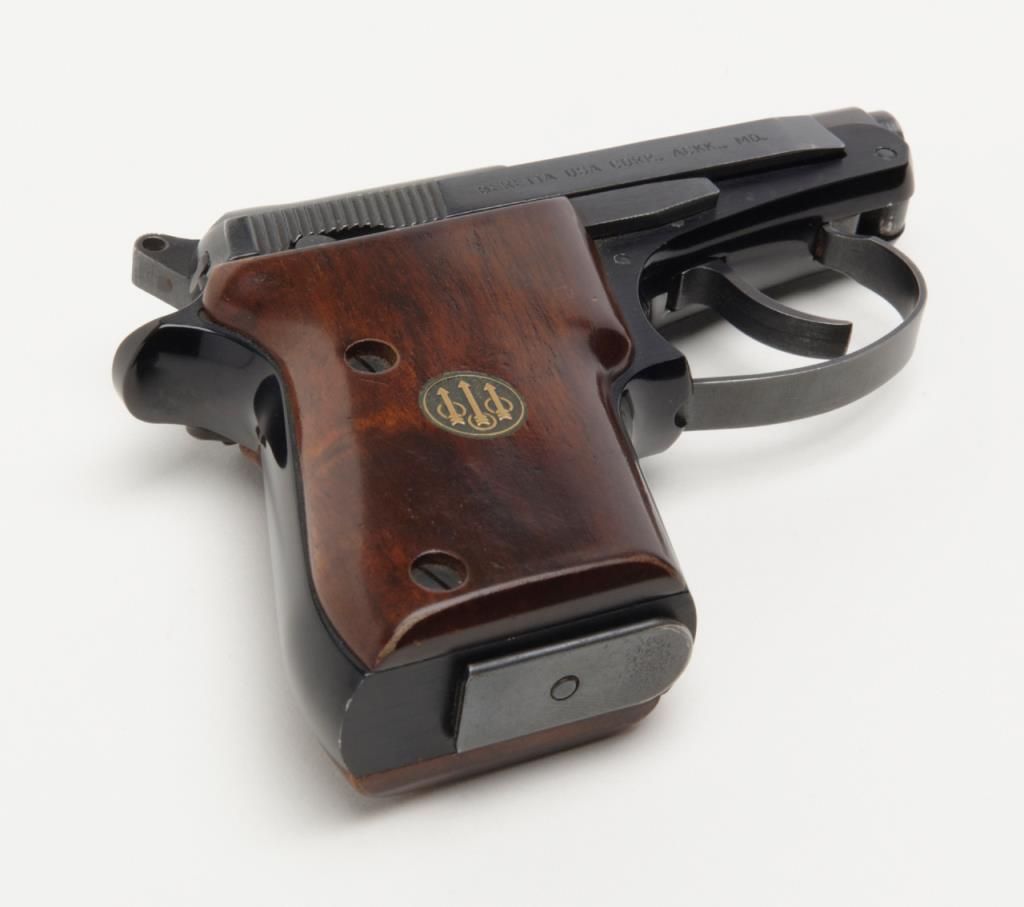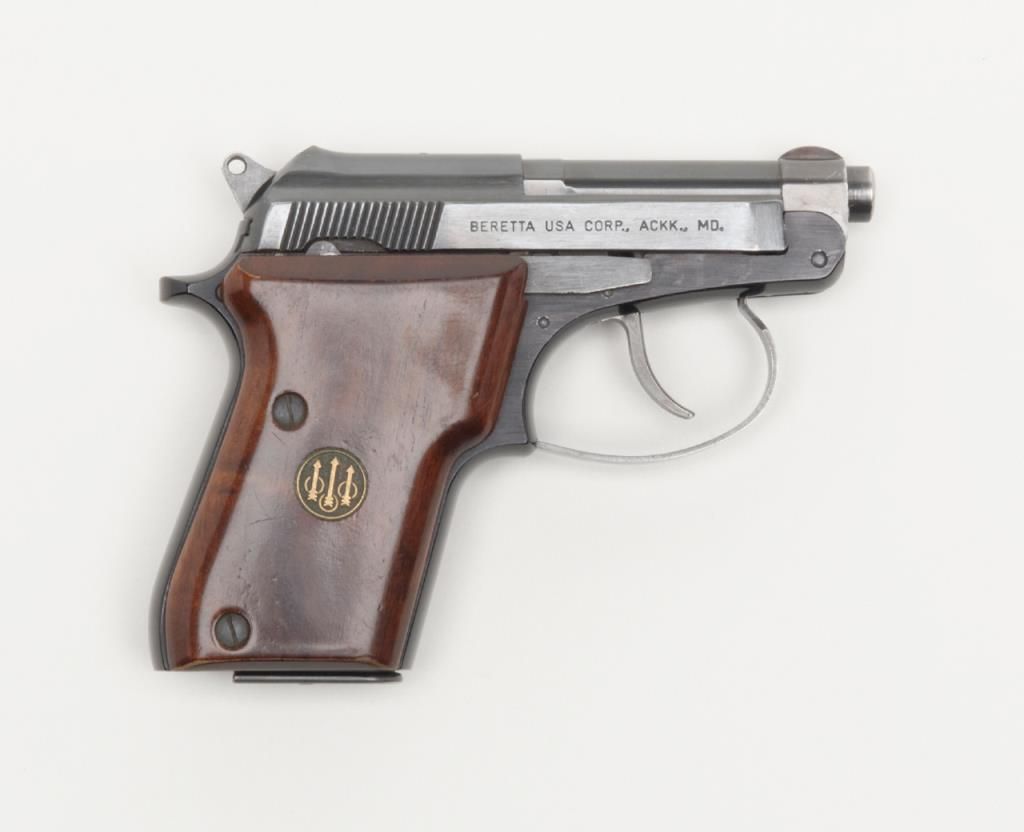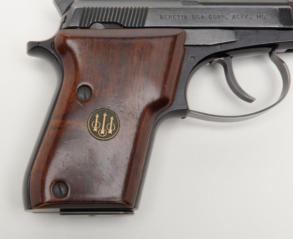Beretta Model 21A, semi-automatic pistol, cal. .22 LR, Serial #22877U. The pistol is in overall good condition with a 2 1/2" barrel. The pistol retains the majority of its blued finish with some loss at the muzzle and along the slide. Thesmooth wood medallion grips are in good condition with some mars and bruising consistent with use. The bore is good and may well clean. The action is tight and marks clear, the pistol comes with one magazine. (Modern/PPT). Est.: $150-$300