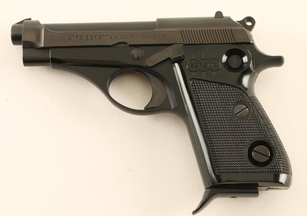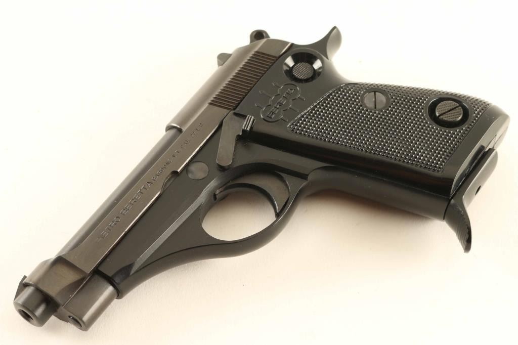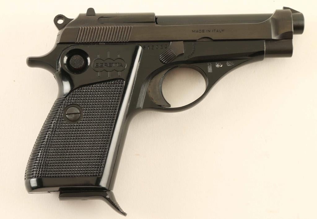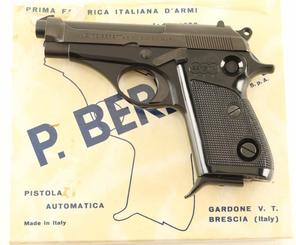 Vintage Italian made single action semi-automatic compact pistol chambered in .22 Long Rifle, manufactured circa 1967. Features a blued/black anodized finish, 3 1/2" barrel, steel guide rod, fixed patridge front sight, dovetailed rear sight with square notch, smooth trigger, serrated round hammer spur, push button safety on the rear of the frame, push button magazine release, factory 9 round magazine with finger rest floorplate, alloy frame, and two-piece checkered black synthetic grips with molded Beretta decor. Includes a factory two-piece cardboard box with fitted styrofoam insert. Pistol retains approximately 99% of it's original finish showing very little wear. Action is smooth, the bore is excellent, and the plastic grips are fine. Condition is NRA Excellent in box. ***Modern Firearm***