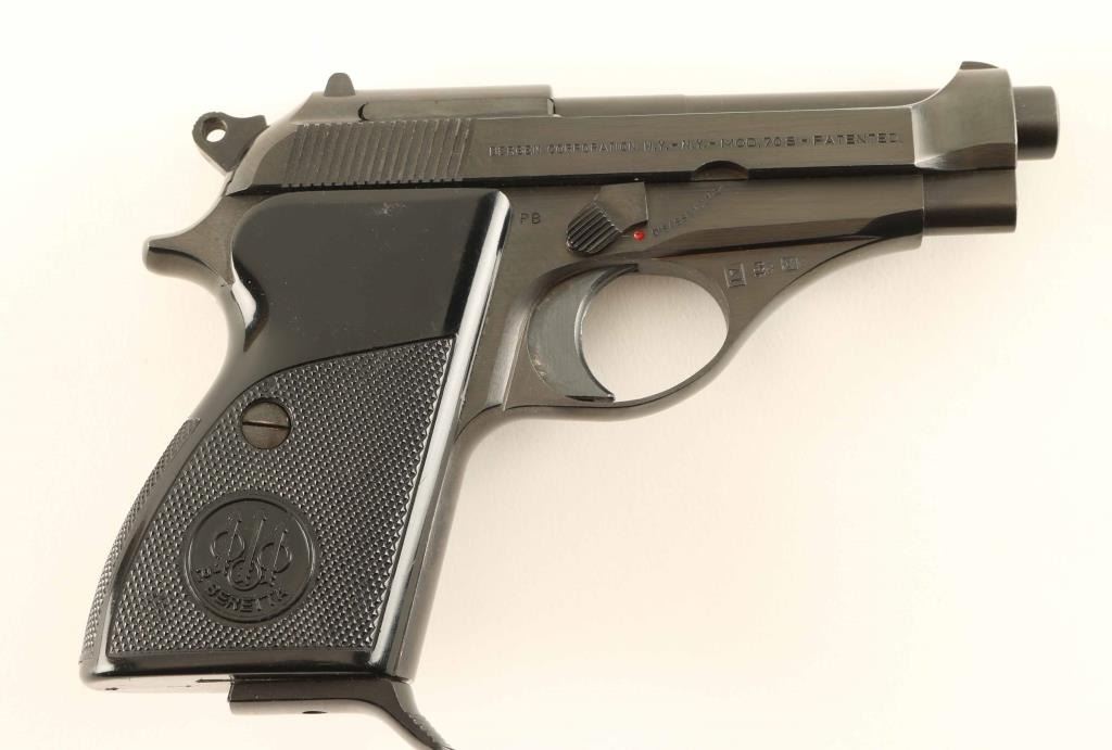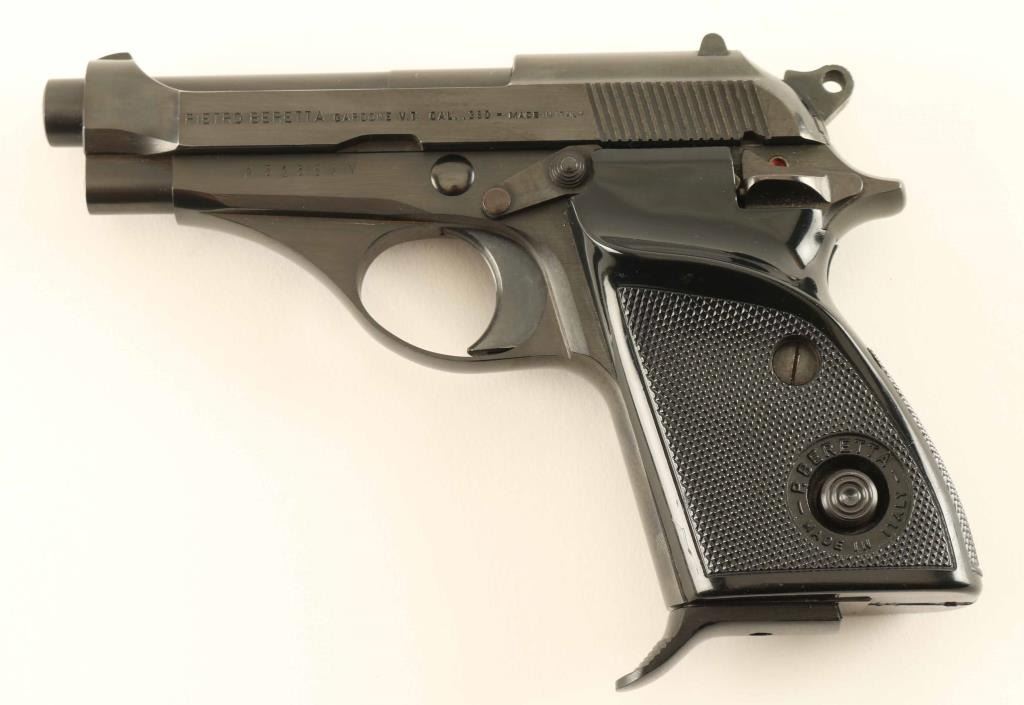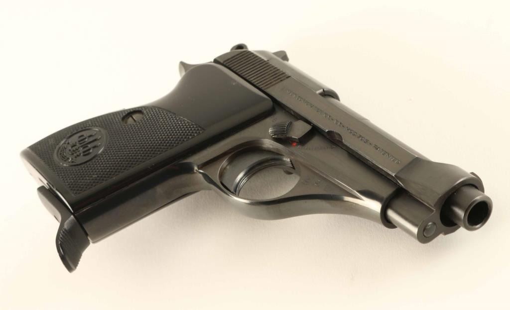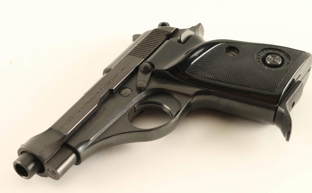 Pistol, Semi-Automatic. Made in Italy. magazine-fed, single-action compact pistol. Replaced the M35, 7.65mm. Produced 1958-85. thumb safety of left frame. Blued finish, with checkered. contoured black plastic grips. Magazine release in left grip. Fixed open notch sights. 3.5" barrel. Bore appears very/good, but dirty. Action is smooth/tight. Finish is about 99%, with some minor scratches. Grips are in good shape, with minor scratches on the plastic. Comes with one 8-rd Beretta magazine, with serrated finger extension. NRA Condition-very good, plus. Modern Firearm.
