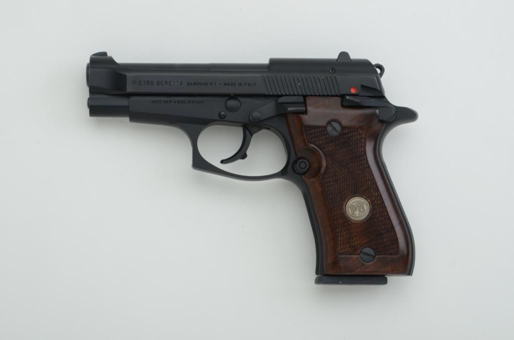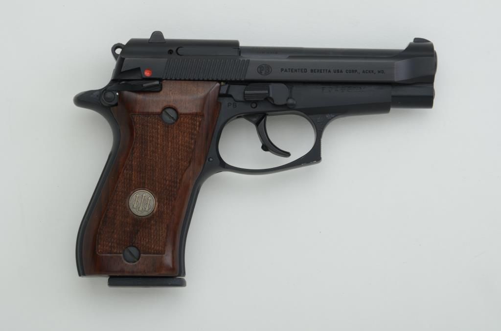 Beretta Model 85F DA semi-auto pistol, 9mm short cal., 3-3/4” barrel, black finish, checkered wood grips, #F04937Y. This gun is in like new condition showing little handling, in factory plastic carry case withinstructions and extra magazine. Est.: $350-$700.