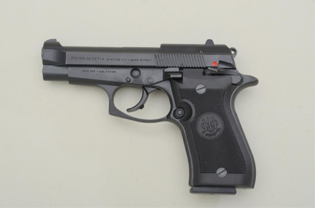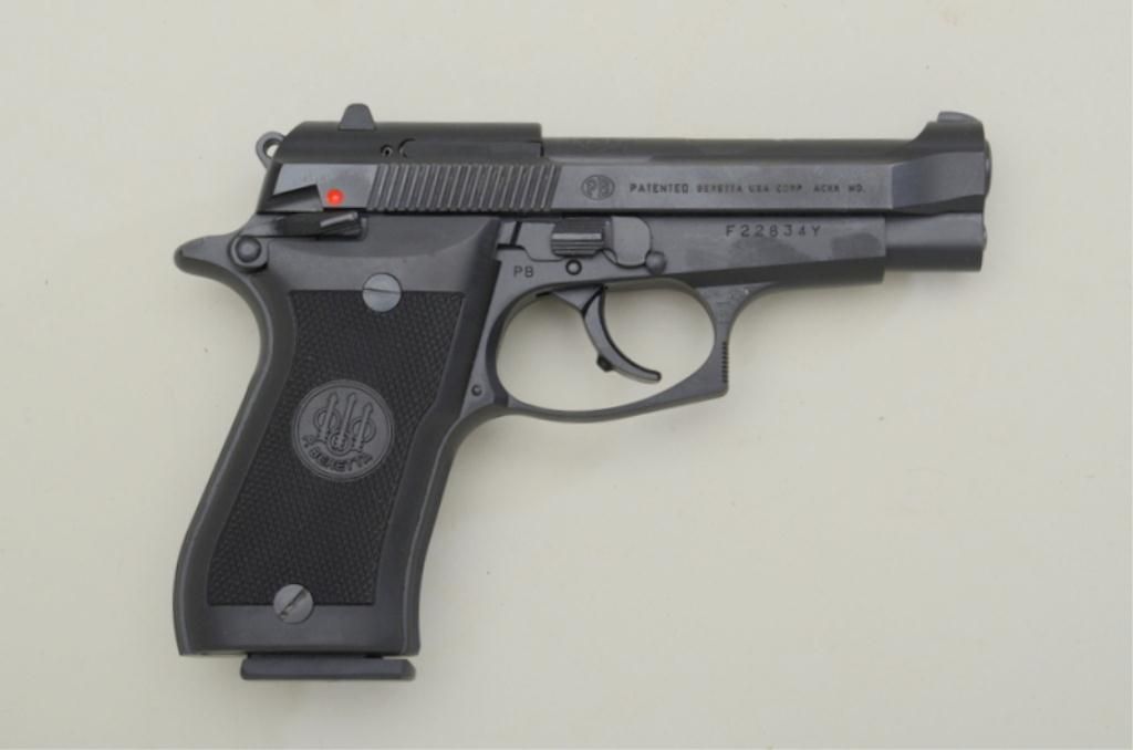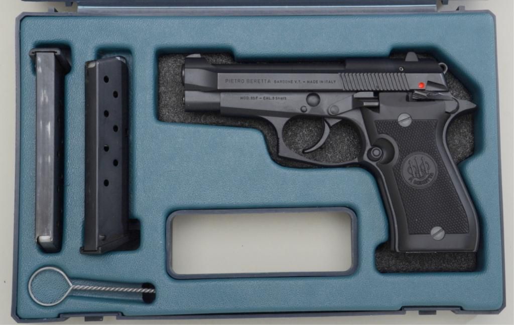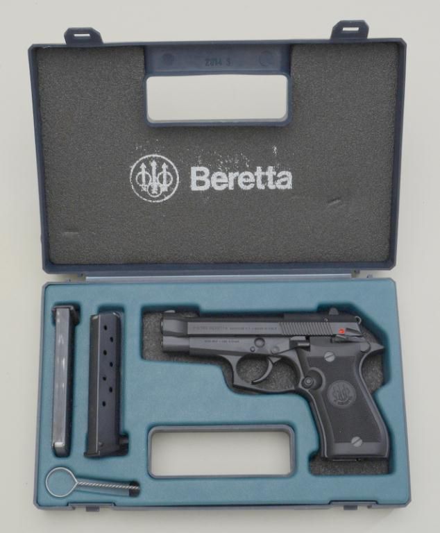 Beretta Model 85F DA semi-auto pistol in factory blue hardcase with extra magazine and cleaning brush, .380 cal., 3-3/4” barrel, mat black finish, checkered black plastic grips, #F22834Y. This gun is in overall finecondition showing the majority of its original finish; very good to fine bore, crisp action and markings, fine grips, very good case with instructions. Est.: $350-$700.