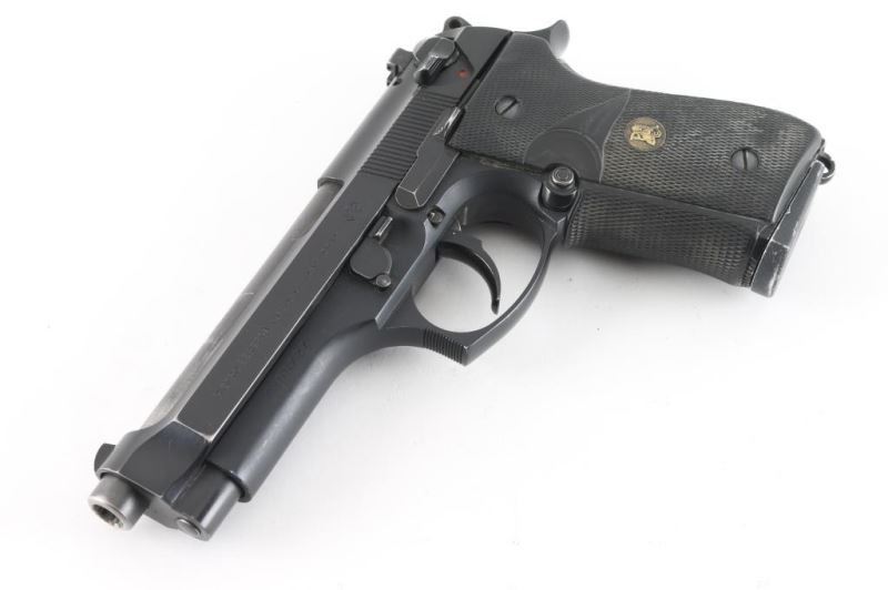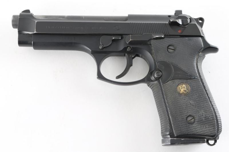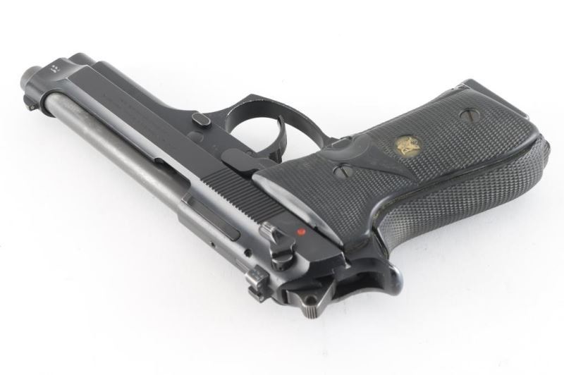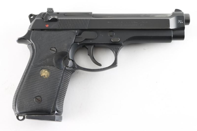 Italian semiautomatic pistol imported by Beretta USA, Gardone VT. Features blued steel parts, black finished alloy frame, checkered black plastic grips, 5" chrome lined barrel, fixed three dot night sights, push button magazine release, slide mounted ambidextrous decocking safety. Bore is excellent condition. Retains 90% finish with bare metal on most sharp edges or corners. Action is smooth/tight. Wraparound Pachmayr grips are good condition. Includes (1) magazine. Condition is NRA Very Good *** Modern Firearm ***
