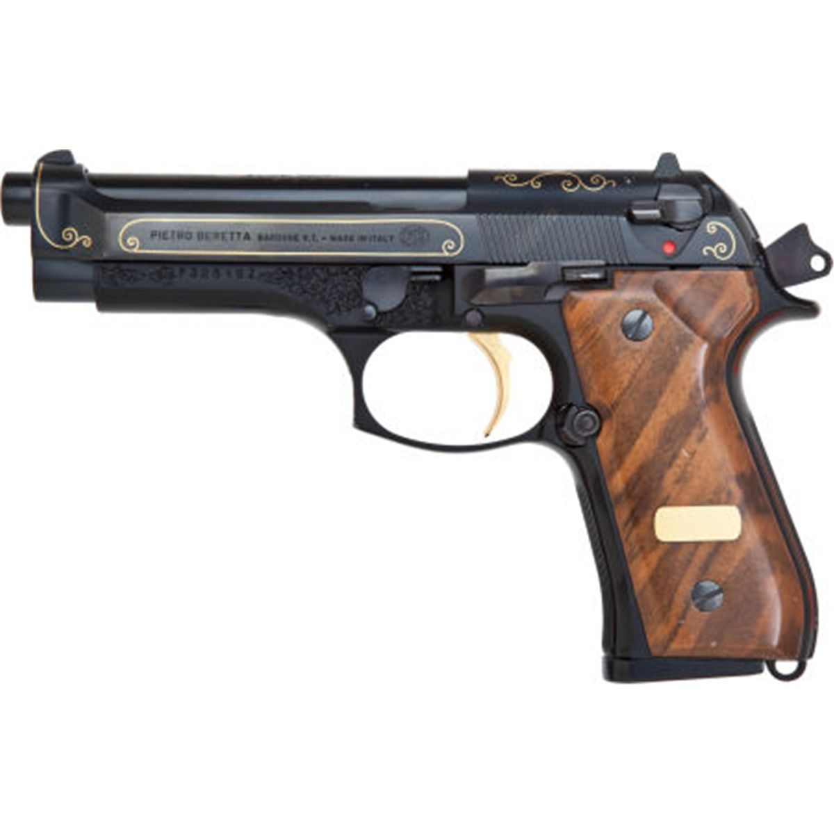 Beretta Model 92FEL 9mm Deluxe Gold Engraved Semi-Automatic Pistol. Serial no. F32519Y, 9mm, 4.9" barrel, blue finish, select walnut grips, elaborate engraved receiver, slide, & barrel with gold trigger, inlaid gold pin-striping & gold grip plaque, 3-dot fixed sight, comes with two-15 shot magazines, manual, cleaning brush & factory plastic case in Beretta cardboard box. Special order exclusively from the "Beretta Gallery"-MSR $4849.00.Condition: As-New in factory box. Bore bright and action crisp.NRA FIREARMS FOR FREEDOM PROGRAM