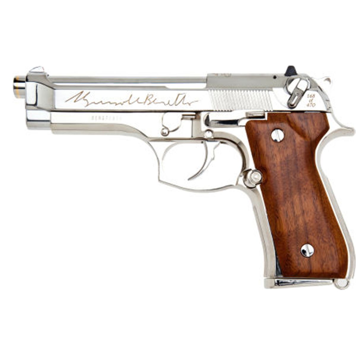 Beretta Model 92FS 470th Anniversary 9mm Semi-Automatic Pistol, #168 of 470. Serial no. BER070934, 9mm, 4.9" barrel, bright stainless steel polished finish, select walnut grips with inlaid gold medallions, gold-filled engraved slide with Dr. Ugo Beretta's signature and 470th anniversary logos, serial numbered #168 of 470 made. Ambidextrous safety (de-cocking lever), 3-dot fixed sights, with one 10-shot magazine, manual, and factory plastic case, in Beretta cardboard box. MSR $2,217. Condition: As new in factory boxes. Bores are bright, actions are crisp. NRA FIREARMS FOR FREEDOM PROGRAM