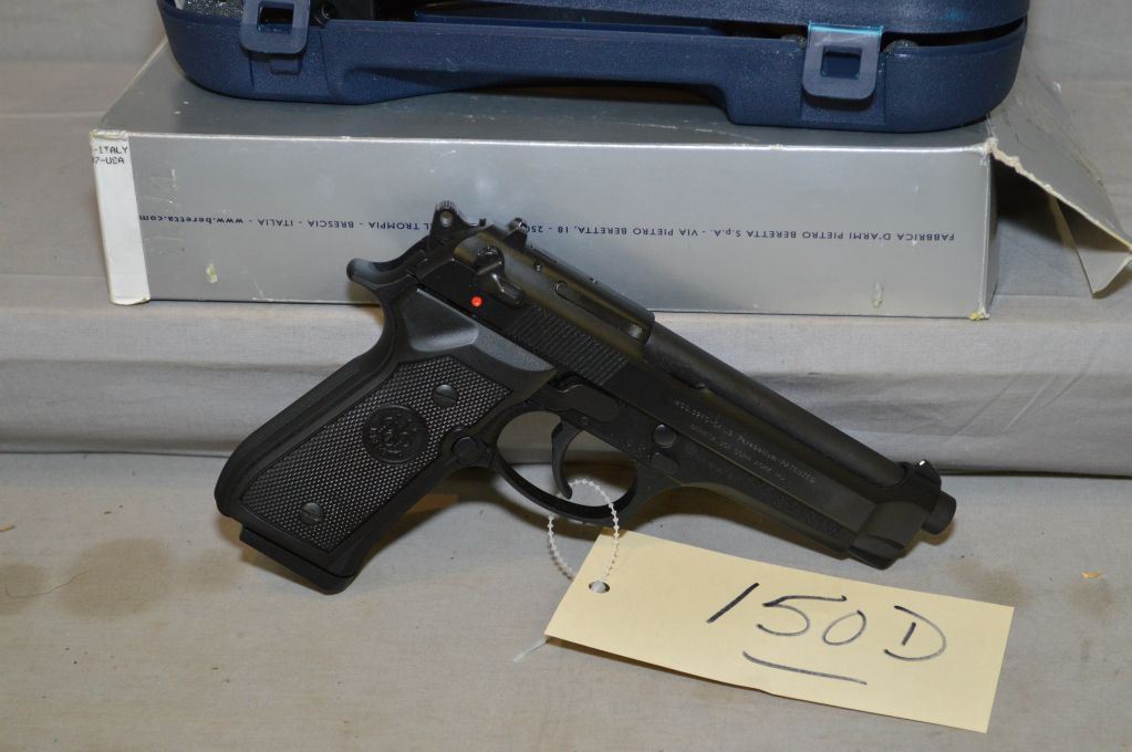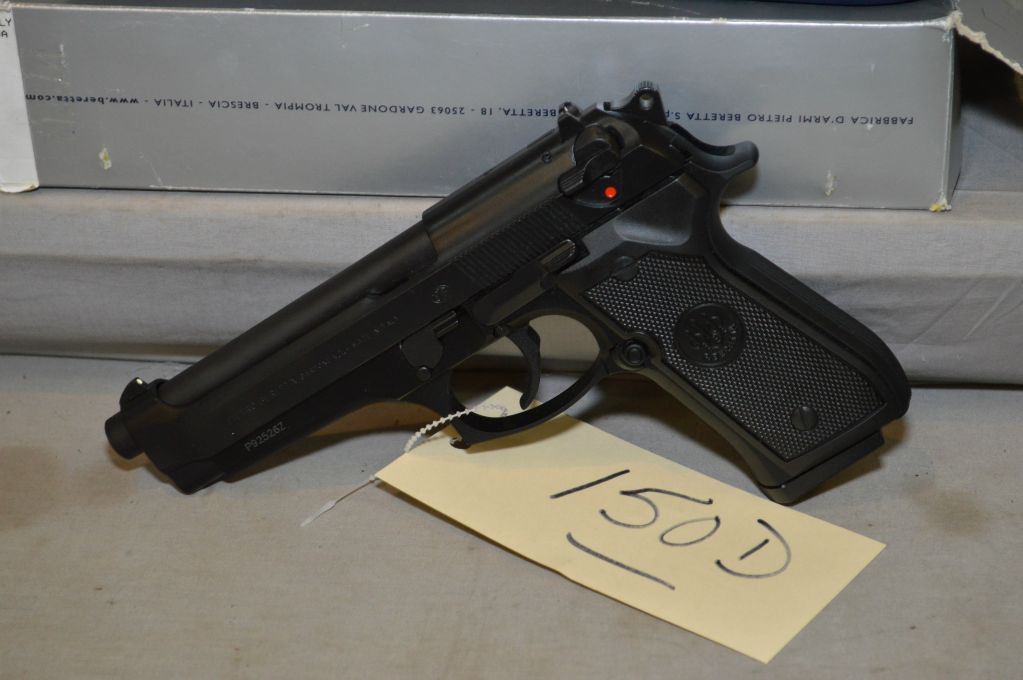 Beretta Model 92FS .9 MM Cal 10 Shot Semi Auto Pistol w/ 125 mm bbl [ appears as new, unfired in orig foam lined plastic case, blued finish, with extra mag & cable lock, booklet, & outside cardboard box , blued finish, White Dot sights, black Beretta insignia grips ] Ser # P92526Z Restricted Handgun Cert # 138981385