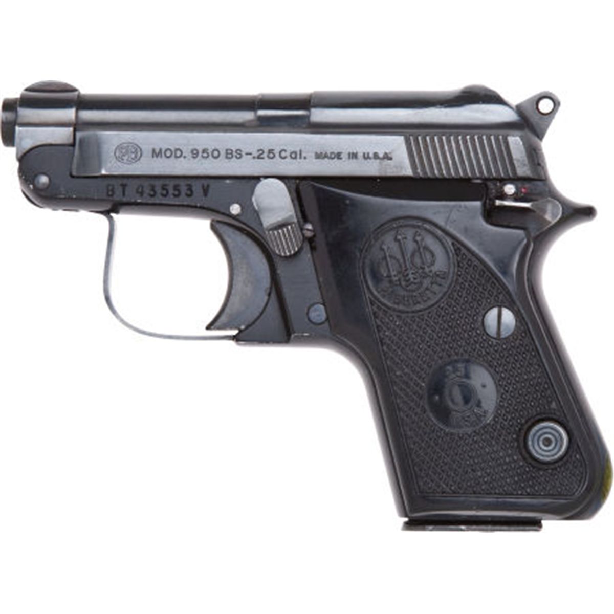 Beretta Model 950BS Semi-Automatic Pistol. Serial no. BT43553V, .25 caliber, 2 3/8-inch barrel. Blued finish. Checkered black composition grips. Condition: Excellent with light handling and storage wear. NRA FIREARMS FOR FREEDOM PROGRAM