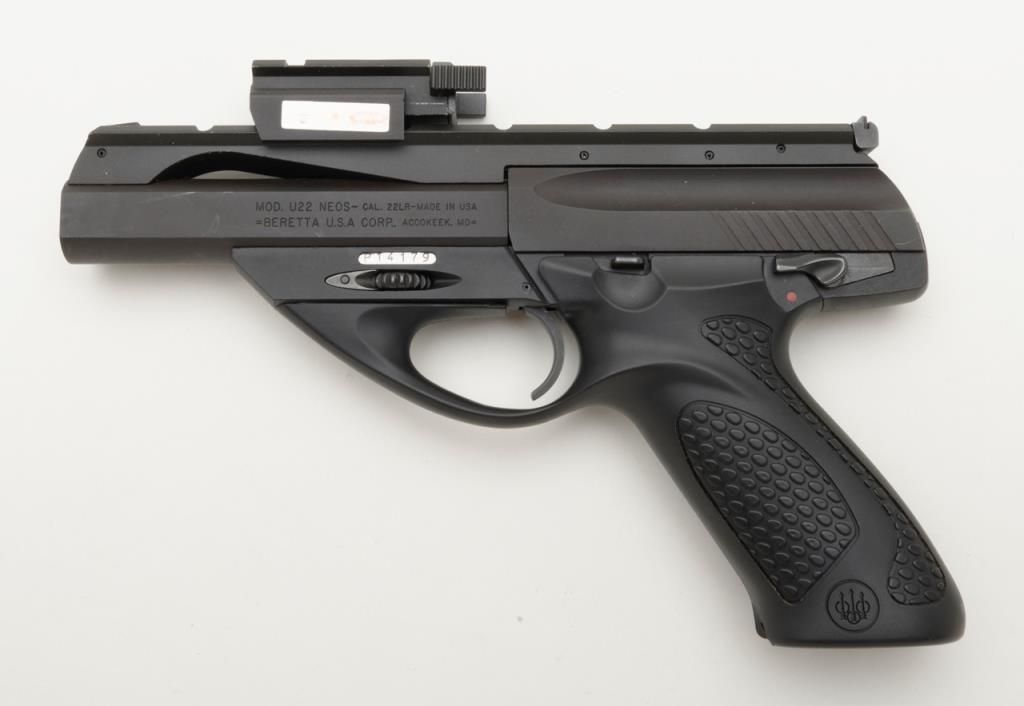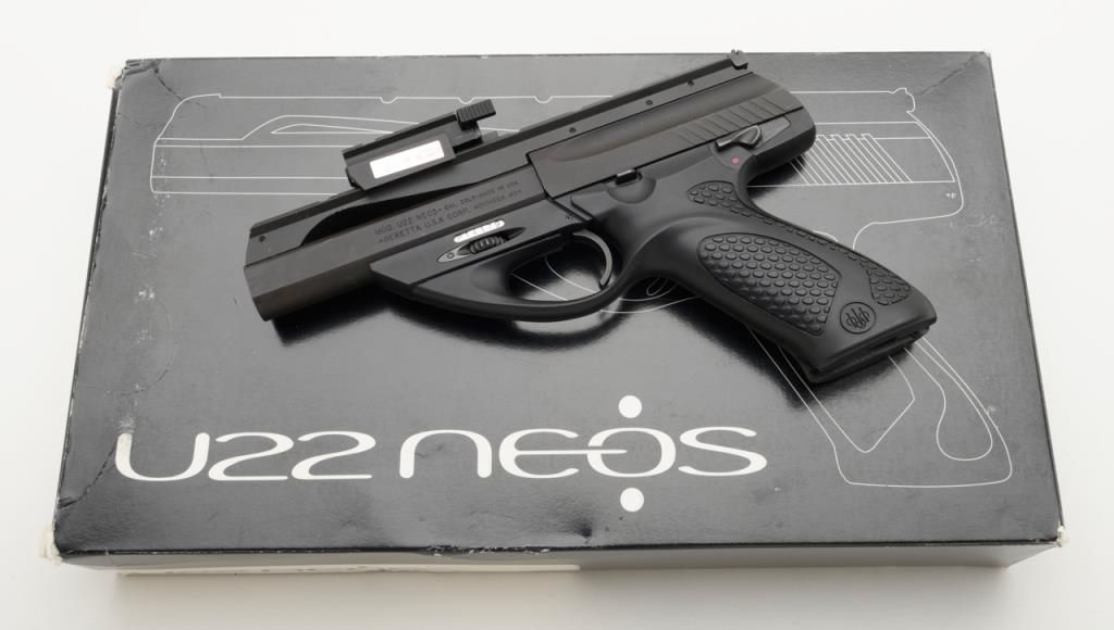 Beretta Model U22 Neos, semiautomatic pistol in fine to excellent used condition in original factory box, serial number P14179. The pistol has been mounted with a laser sighting device. The condition is fine to near excellent with slightuse. No clip. Est.: $175-$350