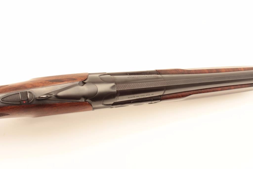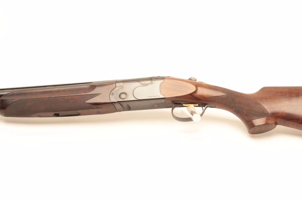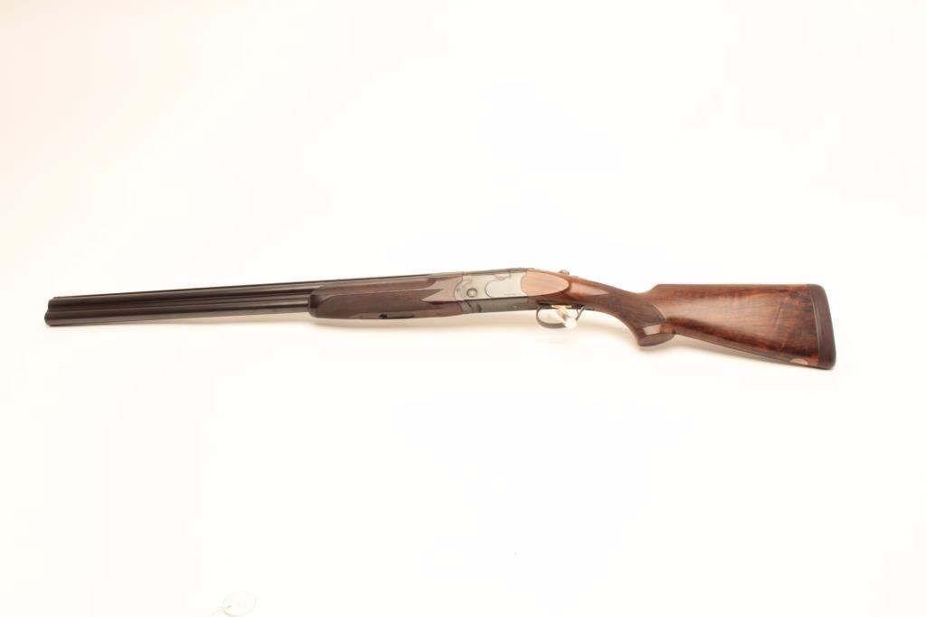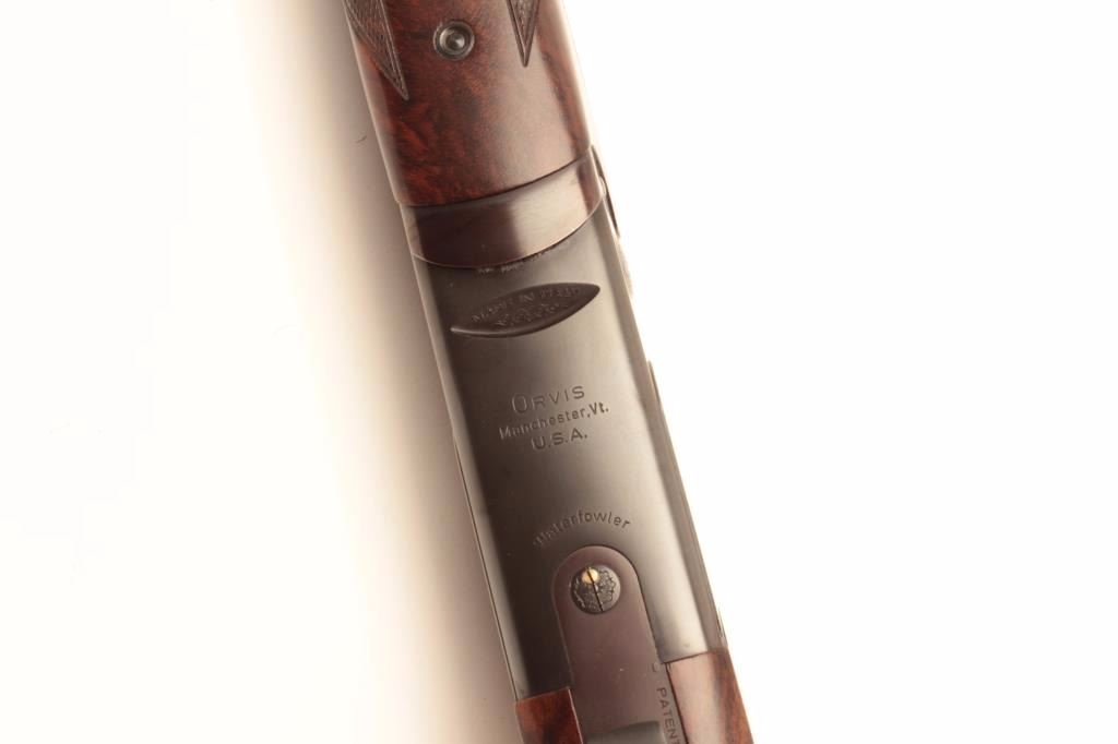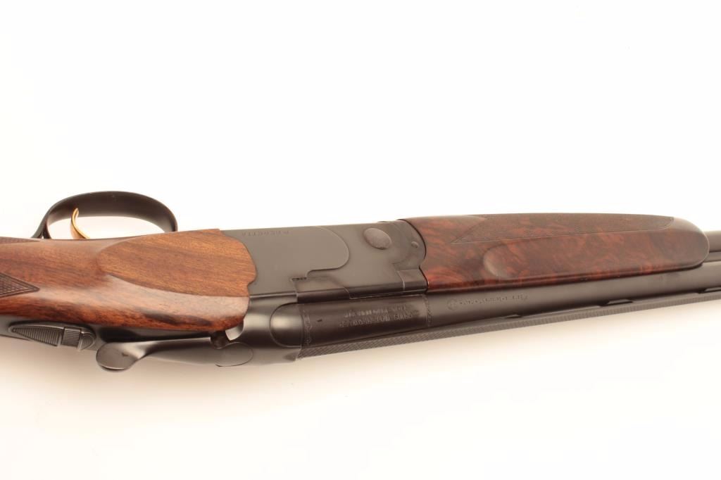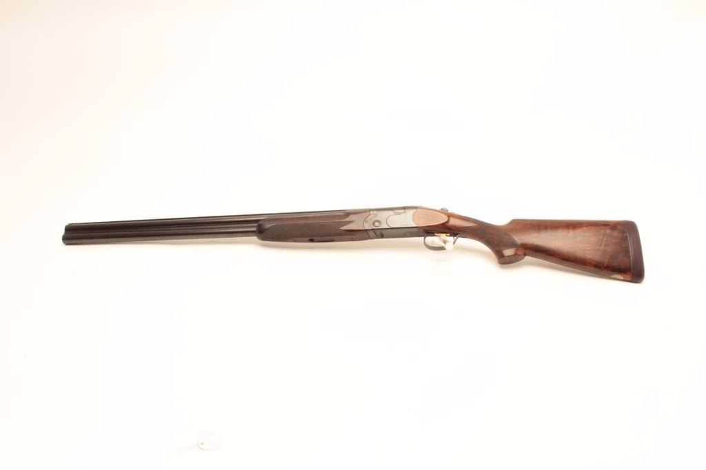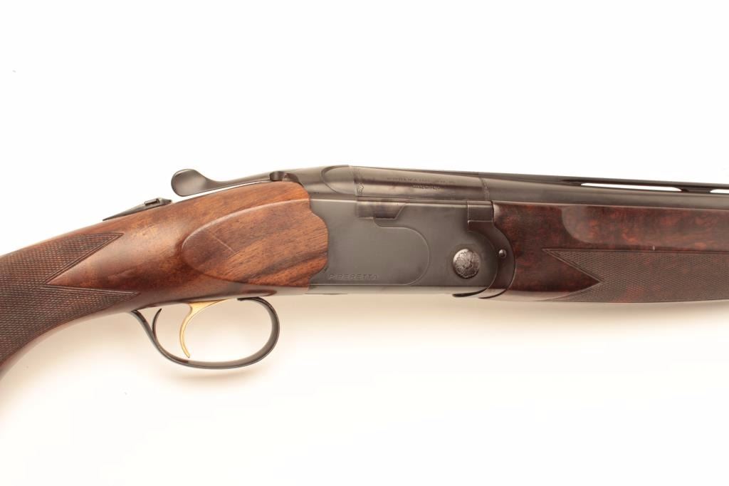 Beretta Orvis Waterfowler Model O/U shotgun, 12 gauge, Serial #F15982B. The shotgun is in very good to nearly fine overall condition with 28” barrels with a steel bead front sight and a filed, full-length ventilatedrib. The barrels and receiver retain nearly all of their blue finish with only storage marks noted. The finely checkered, highly figured wood stocks are in very good condition with small mars and handling marks. The butt stock ends with a leather covered pad providing a 14” LOP to a single gold trigger. The bores are very good, the action crisp and markings are sharp on this lightly used Beretta. The lot includes a choke kitand wrench in a Bob Allen pouch. Est.: $1,200-$2,400. (Modern).