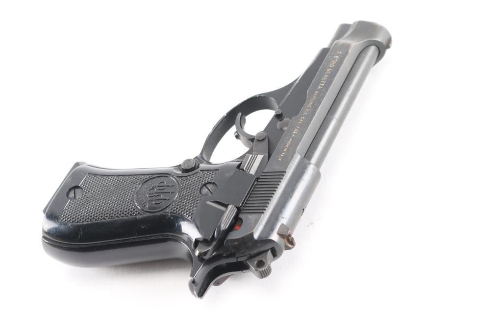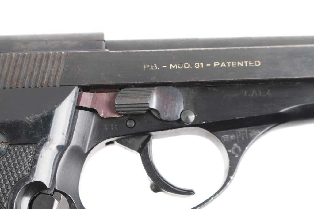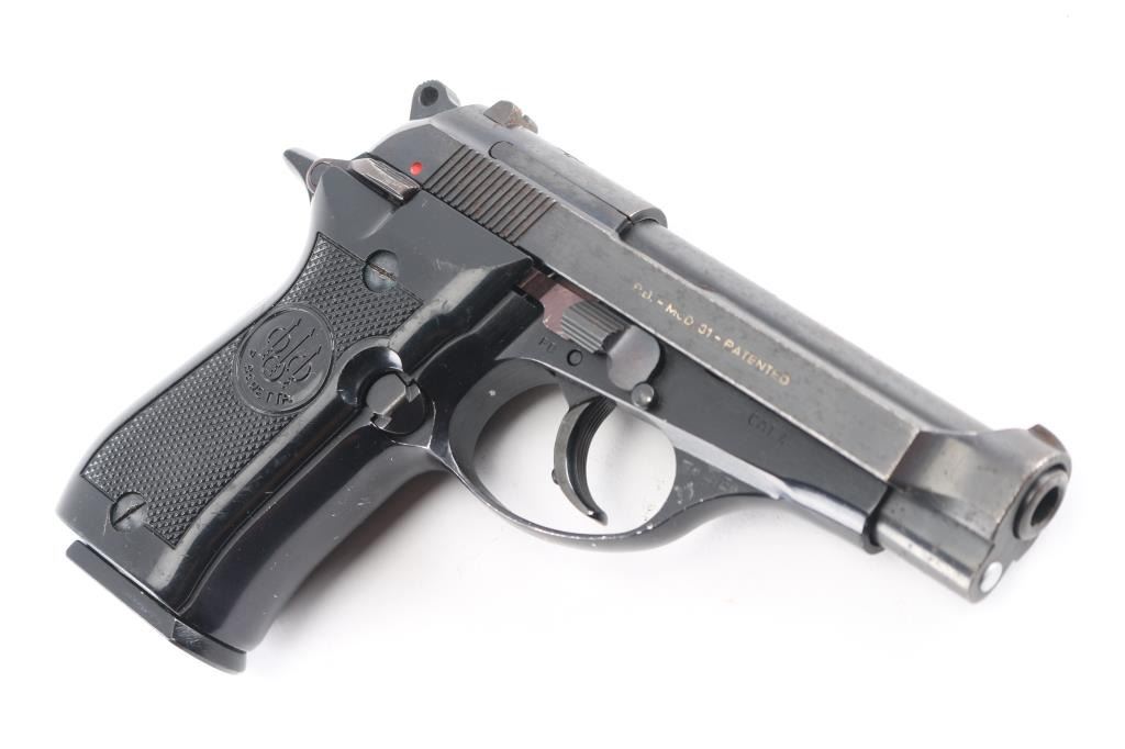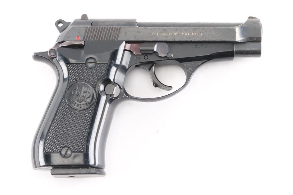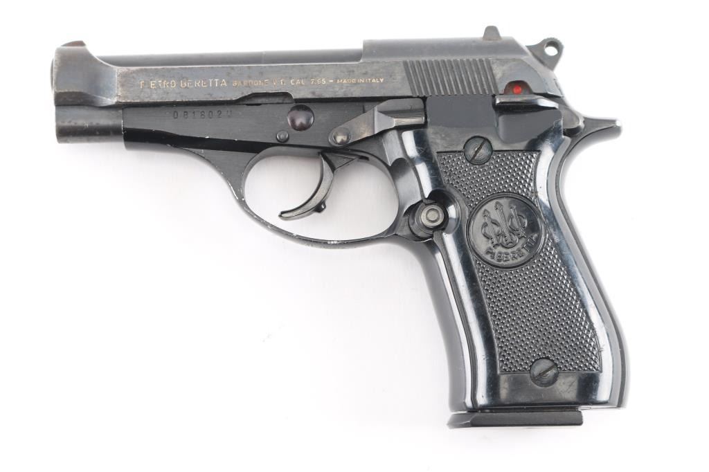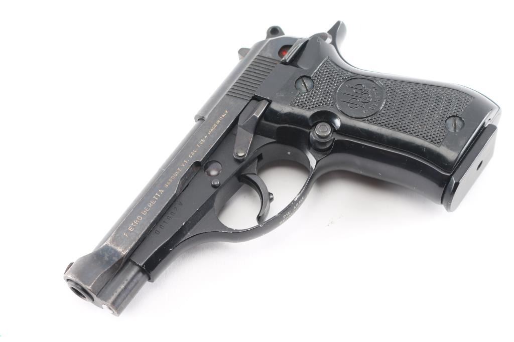 Italian made double action semi-automatic compact pistol chambered in .32 Auto, circa 1981. Imported by PW Arms, Redmond WA, with import stamp under the trigger guard. Features a blued slide, 3.8" barrel, fixed front sight, dovetailed rear sight with square notch, serrated trigger, serrated round hammer spur, ambidextrous thumb safety, push button magazine release, black finished alloy frame and two-piece checkered black synthetic grips with Beretta decor. Bore is very good condition. Retains 85% of it's original finish showing edge losses, fading, patina, some thin rust on rear sight. Grips are very good with handling marks. Includes one magazine.