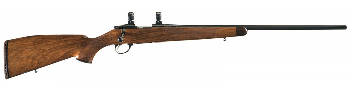 Manufactured without sights, mounted on a fancy checkered walnut pistol grip stock with rosewood forearm cap, rosewood grip cap, sling swivel studs and a vented rubber recoil pad. With scope mounts and locking caps missing from the rings.