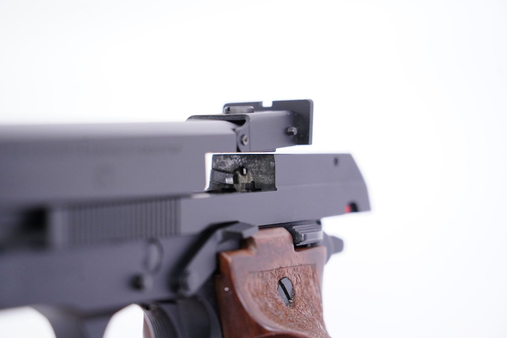 Sights/ Optics: The front sight is a blade fixed to the front of the barrel and the rear sight is an adjustable screw-set square-notch fixed ot the top of the slide.