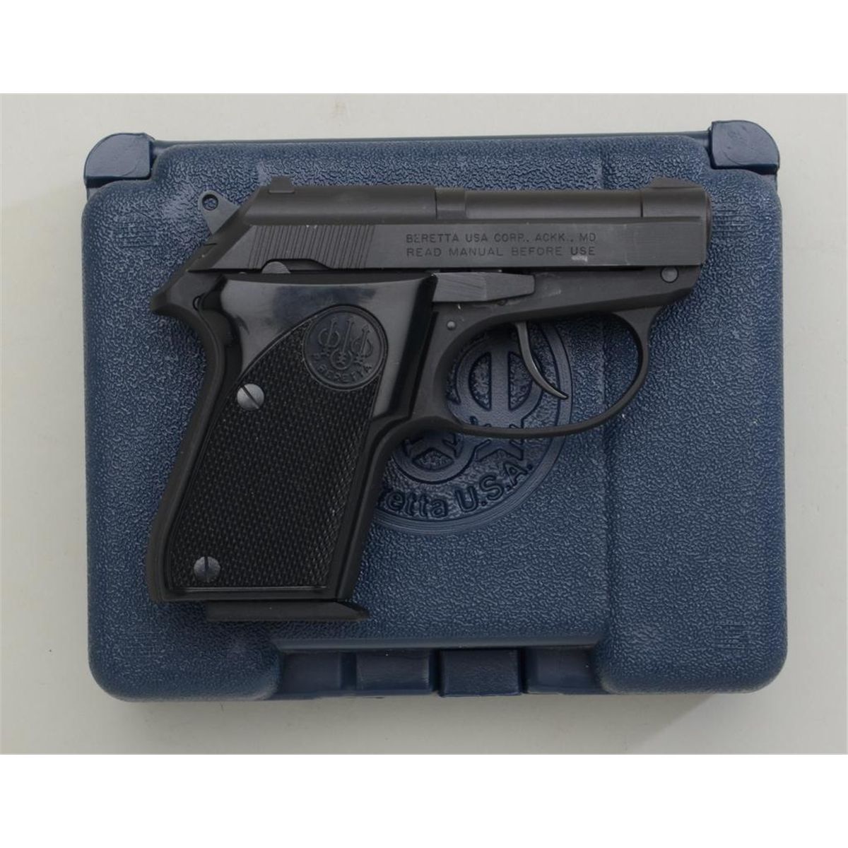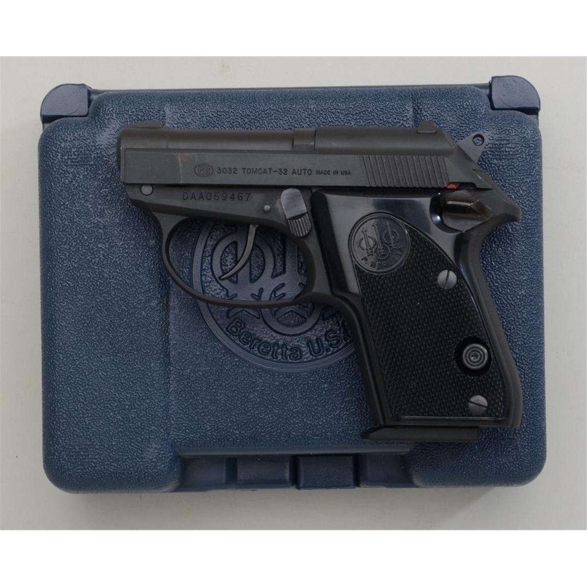 Beretta Tomcat Model DA magazine pistol, .32 cal., 2-1/2” barrel, mat black finish, checkered black plastic grips, #DAA059467 in factory blue plastic carry case with one extra magazine and instructions booklet.This gun is in overall excellent condition showing approx. 98% original finish, fine bore, crisp action, sharp markings and fine grips. Est.: $200-$400.
