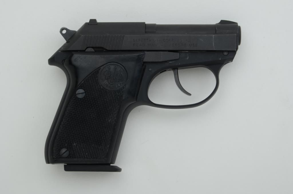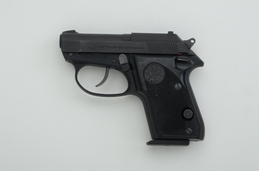 Beretta model 3032 Tomcat DA semi-auto pistol, .32 cal., 2-1/2” barrel, mat black finish, checkered black plastic grips, #DAA174559, in blue factory plastic case with instructions and slip cover numbered topistol. This gun is in overall fine condition showing the majority of its original finish, fine bore, action and grips. Est.: $125-$250.