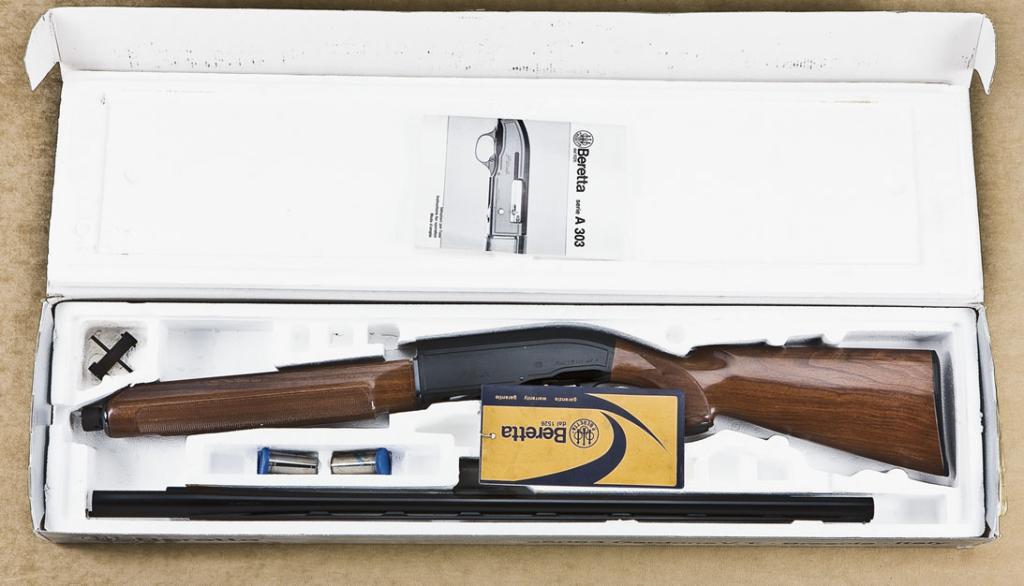 Beretta model A303, 12ga, semi-automatic shotgun. Like new in box, with screw in chokes. 99% plus to new. Serial M54317E. Est. $400 - $800