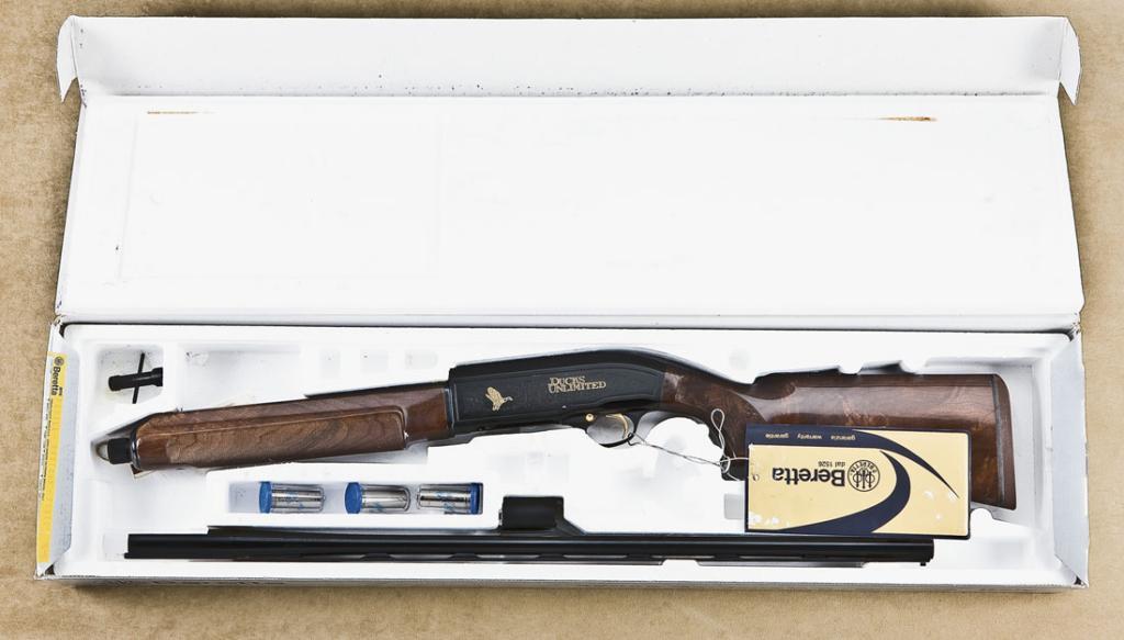 Beretta model A303, 20ga, semi-automatic shotgun, special Duck’s Unlimited series, 3” mag, with screw-in chokes. Excellent to like-new in original box, 99% plus. Shows exceptional checkered burl wood stocks. Serial number “L80798E”. Est.: $600 - $1200.