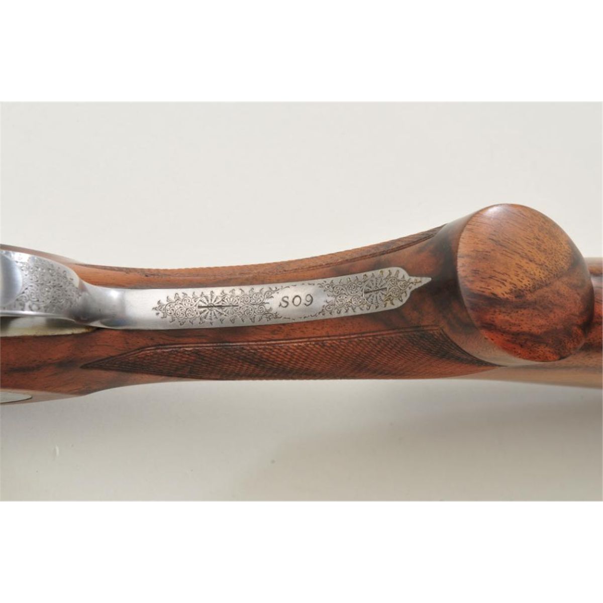Beretta model SO9 special 410ga over/under shotgun with full sidelock action, highly engraved in game scene and scrolls, signed Hassa, dated 1992. The gun shows 26-5/8” barrels, hand filed raised milled rib with no vent. Choked Improved Modified over Improved Cylinder. Beautifully stocked in select burl walnut with pistol grip and English style checkered butt. The stock measures 15” to the end of the wood. The action is engineturned. The condition is fine to excellent showing minimal firing and slight use only. The gun is contained within its original Beretta deluxe luggage case with small accessories and hanging tag. Purportedly made for factory display. A seldom encountered and very special Beretta. Serial #S09-AAA157B. From the Robert Petersen Estate. Est: $5,000 - $10,000