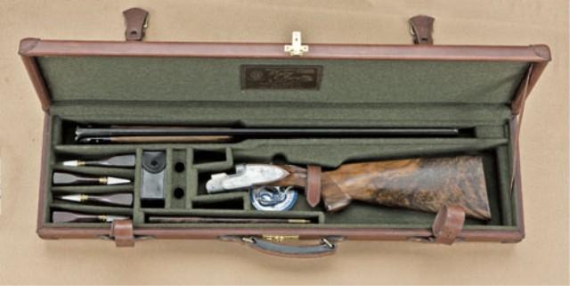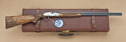 Beretta model SO9 special 410ga over/under shotgun with full sidelock action, highly engraved in game scene and scrolls, signed Hassa, dated 1992. The gun shows 26-5/8” barrels, hand filed raised milled rib with no vent. Choked Improved Modified over Improved Cylinder. Beautifully stocked in select burl walnut with pistol grip and English style checkered butt. The stock measures 15” to the end of the wood. The action is engine turned. The condition is fine to excellent showing minimal firing and slight use only. The gun is contained within its original Beretta deluxe luggage case with small accessories and hanging tag. Purportedly made for factory display. A seldom encountered and very special Beretta. Serial #S09-AAA157B. From the Robert Petersen Estate. Est: $5,000 - $10,000