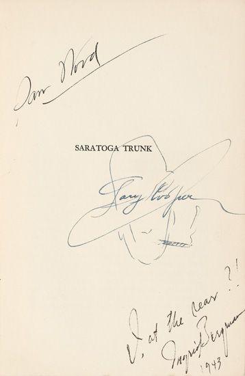 Copy of ''Saratoga Trunk'' owned by Ruth Roberts, voice coach to Ingrid Bergman, who signs the half-title page along with Gary Cooper and Sam Wood. Signed by Bergman, ''I, at the rear?! Ingrid Bergman / 1943'' below a hand-drawn signed self-portrait of Gary Cooper in western hat and cigarette. Also signed by director Sam Wood. With Roberts' signature on the front free endpaper and her notes throughout text, all in pencil. Signatures by Cooper, Bergman and Wood in pen. Book is very worn, though signature page is in very good condition.