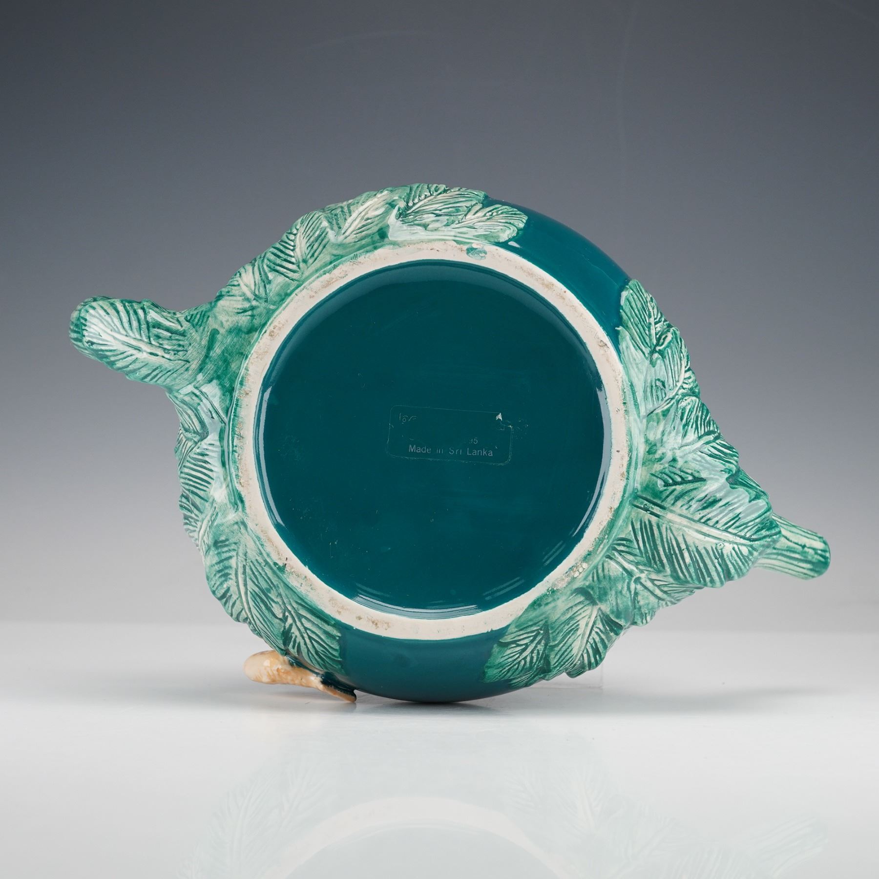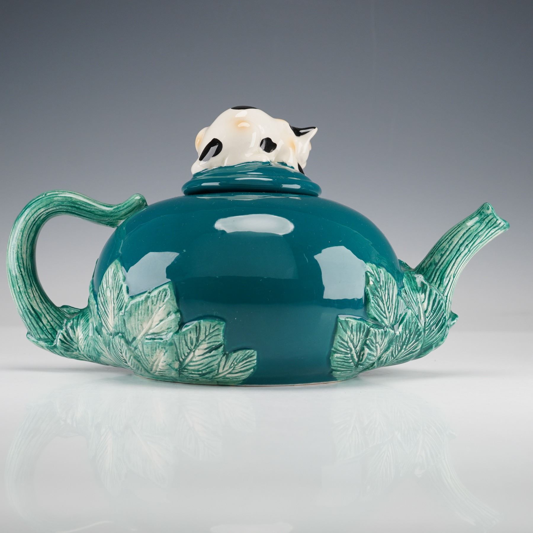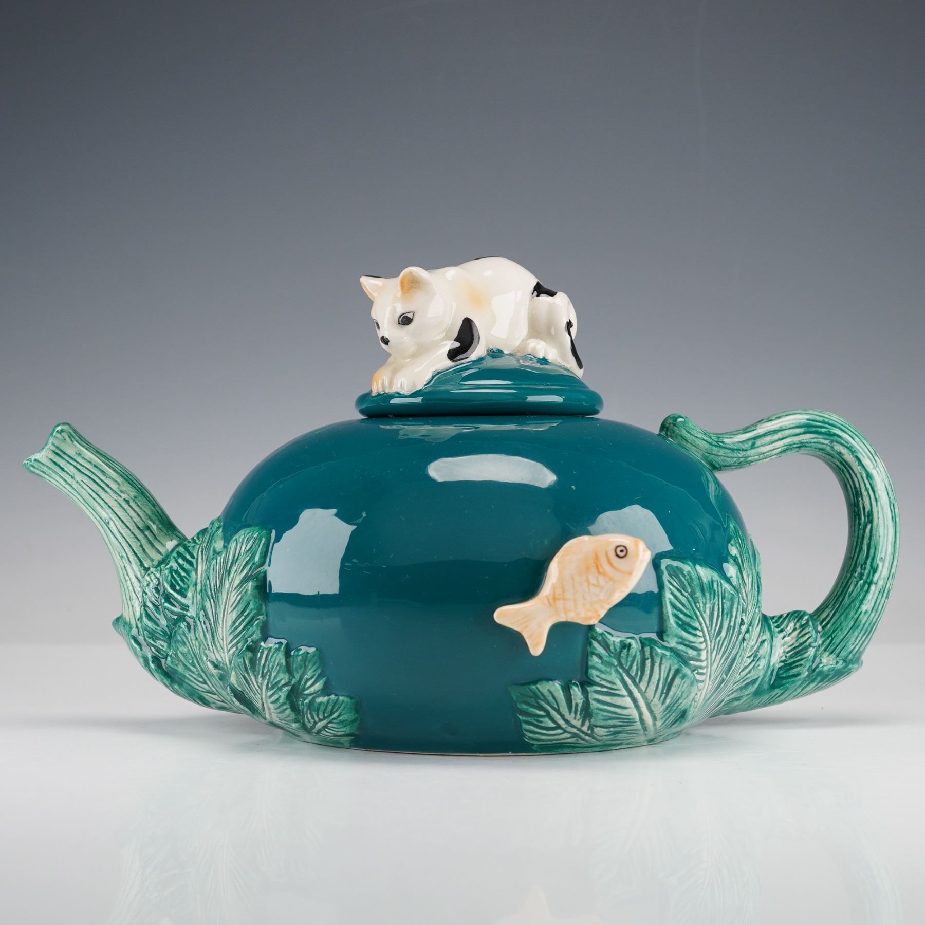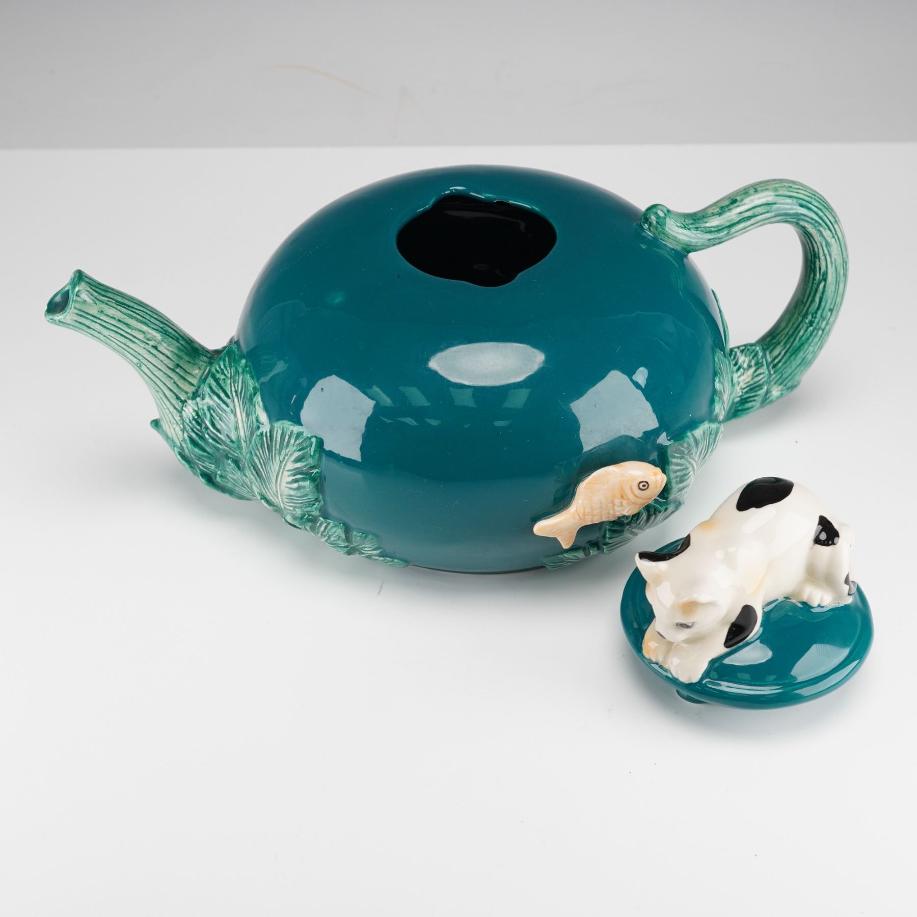 A charming contemporary designed lidded teapot featuring a playful motif. Depicts a black spotted cat perched atop the lid, peering intently at a golden fish affixed to the body of the vessel. The handle and spout are organically integrated into the leafy embellishments. A faint Bergschrund sticker label to the underside.