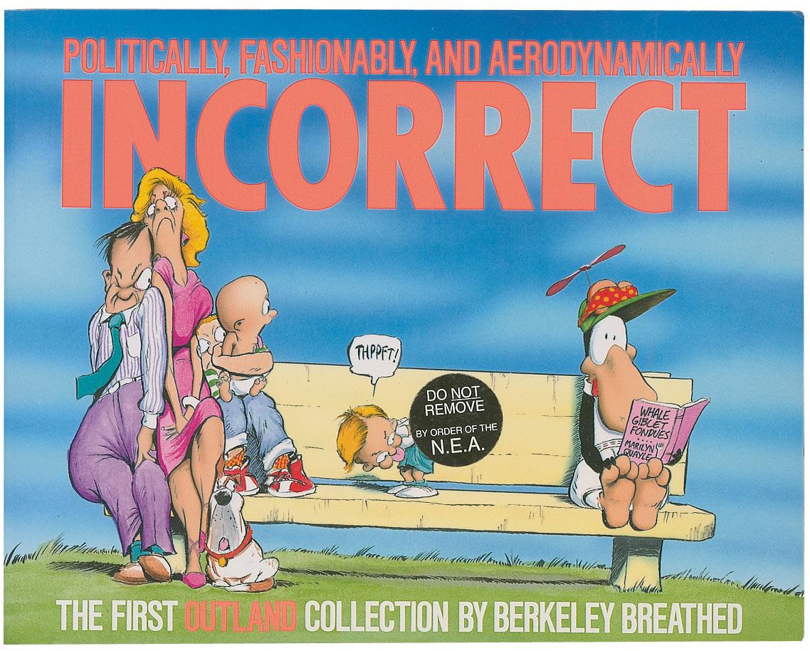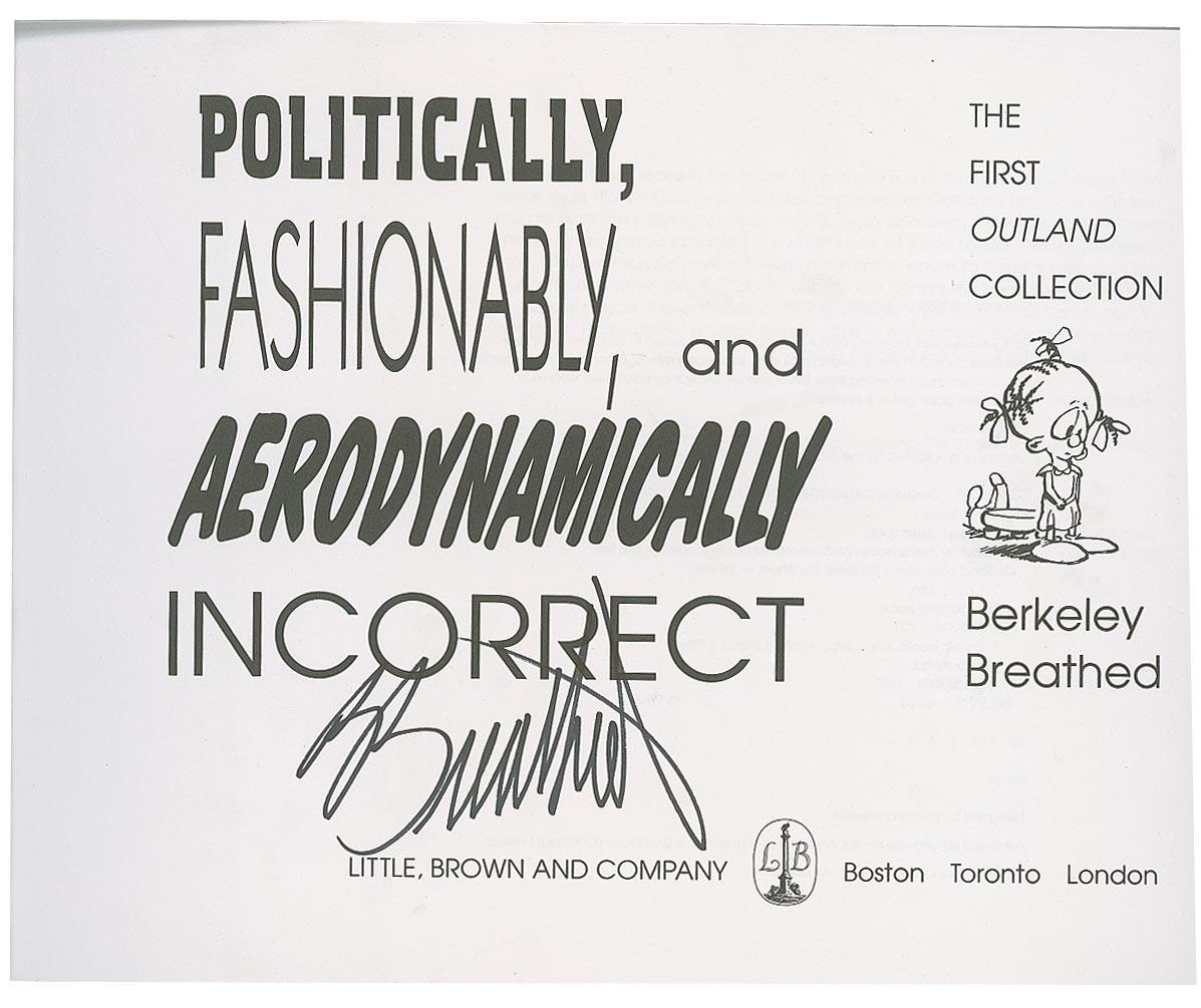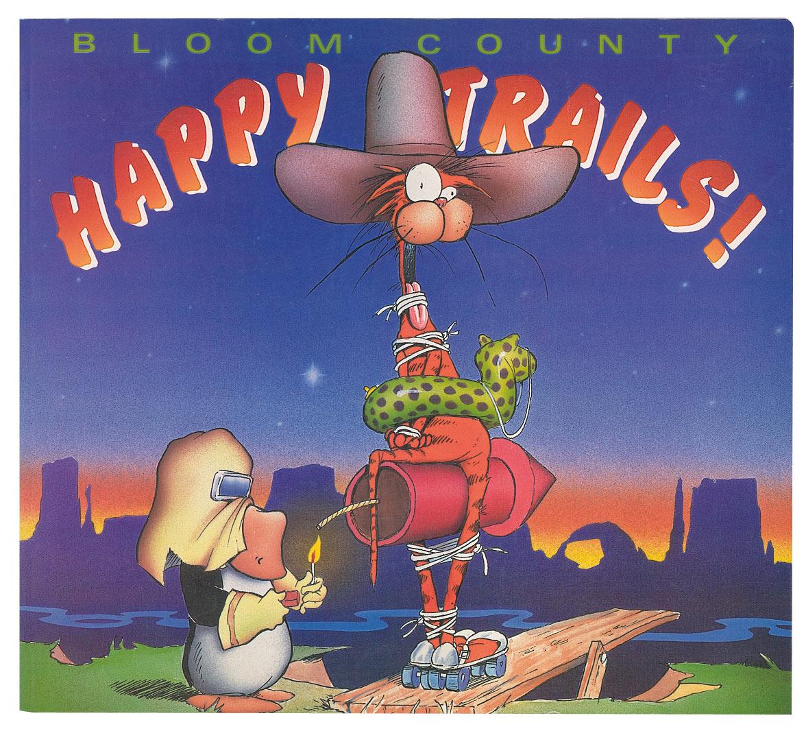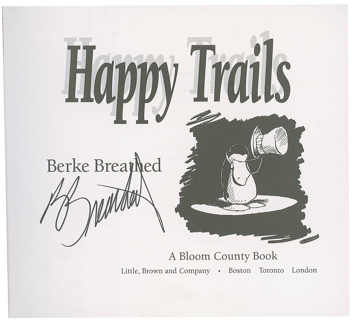 Two softcover Bloom County books, Politically, Fashionably, and Aerodynamically Incorrect and Happy Trails, each signed in black felt tip on the title page. In fine condition, with some light handling wear and a vertical crease to back cover on one book.