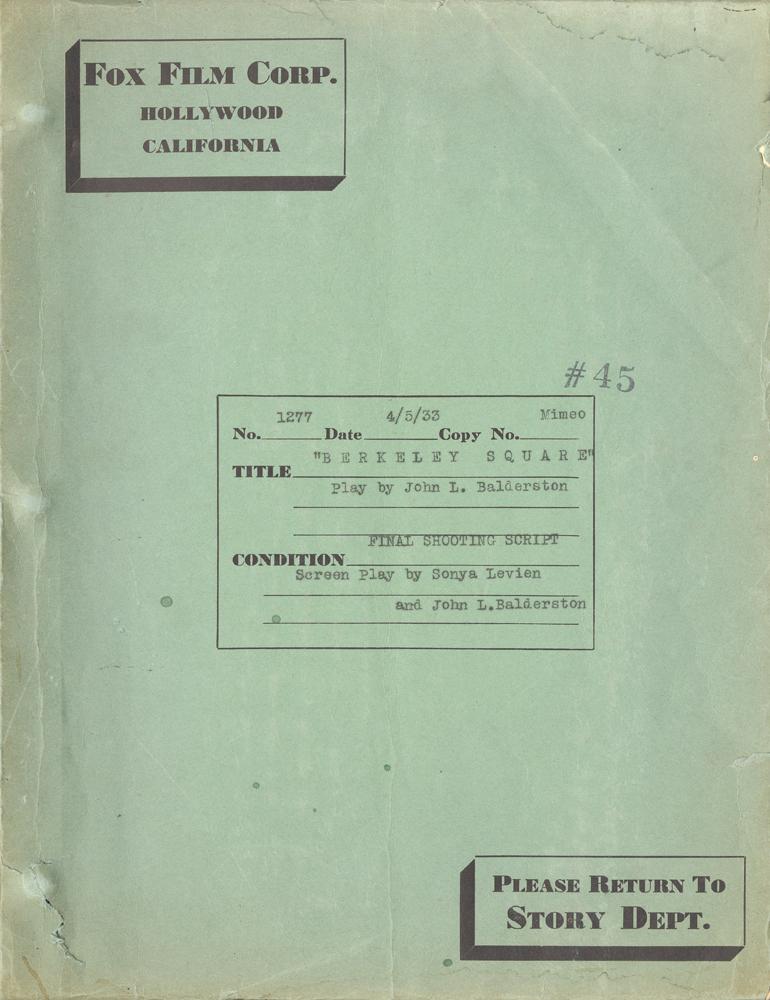 (Fox Film Corporation, 1933) Original studio mimeo, 134 pp in printed covers, final shooting script by John Balderston(from his play) dated 4/5/1933, and stamped “#45”. Story is a fantasy in which an American in London is transported back in time to meet his forefathers. Tattering to cover edges, interior is Very Fine throughout.