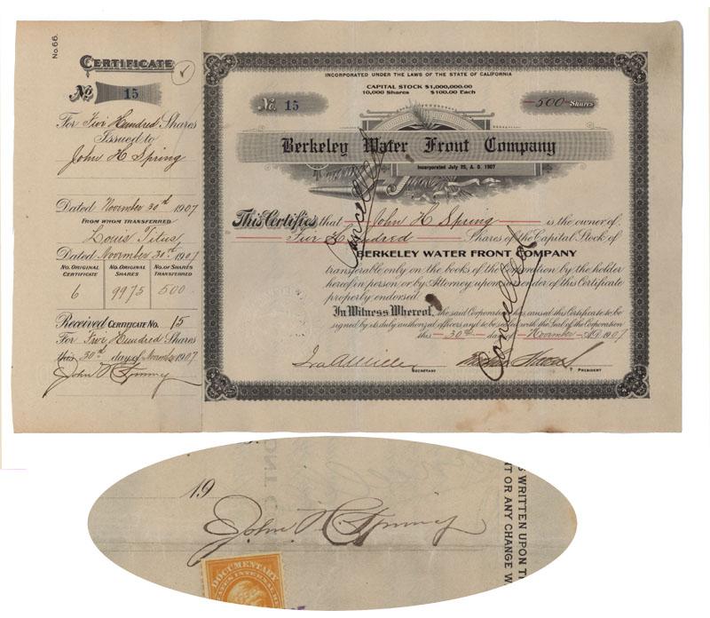 1907, California. Stock certificate for five hundred shares issued to and signed on stub and verso by JOHN HOPKINS SPRING (1862-1933). American businessman who made a fortune in California real estate. . Blind embossed company seal. Revenue stamp affixed on verso. Pen cancellations do not affect Spring’s signatures. Shortly before the incorporation of the Key Route Transbay Ferry System, John H. Spring allied himself with Frank C. Havens, president of the Peoples’ Water Company, and Francis Marion“Borax” Smith, acting as their land agent in large purchases of suburban property at the time they were launching the Realty Syndicate. As real estate prices in Berkeley rose sharply following the 1906 San Francisco earthquake, Spring, who owned large amounts of land in Alameda County north of the Berkeley line, became very wealthy quite quickly, reaching a reputed net worth of $3 million. Aside from these lucrative ventures, Spring founded the Spring Construction Company, owned a quarry, and was a director of the Western National Bank of San Francisco and of the Berkeley National Bank. The Berkeley Waterfront Company, operating in the interests of the Santa Fe, bought up large portions of the Albany, Berkeley, and Emeryville shorelines in the 1890s. These lands remained largely undeveloped until the Golden Gate Turf Club built a racetrack on land leased from the Santa Fe in the late 1940s.