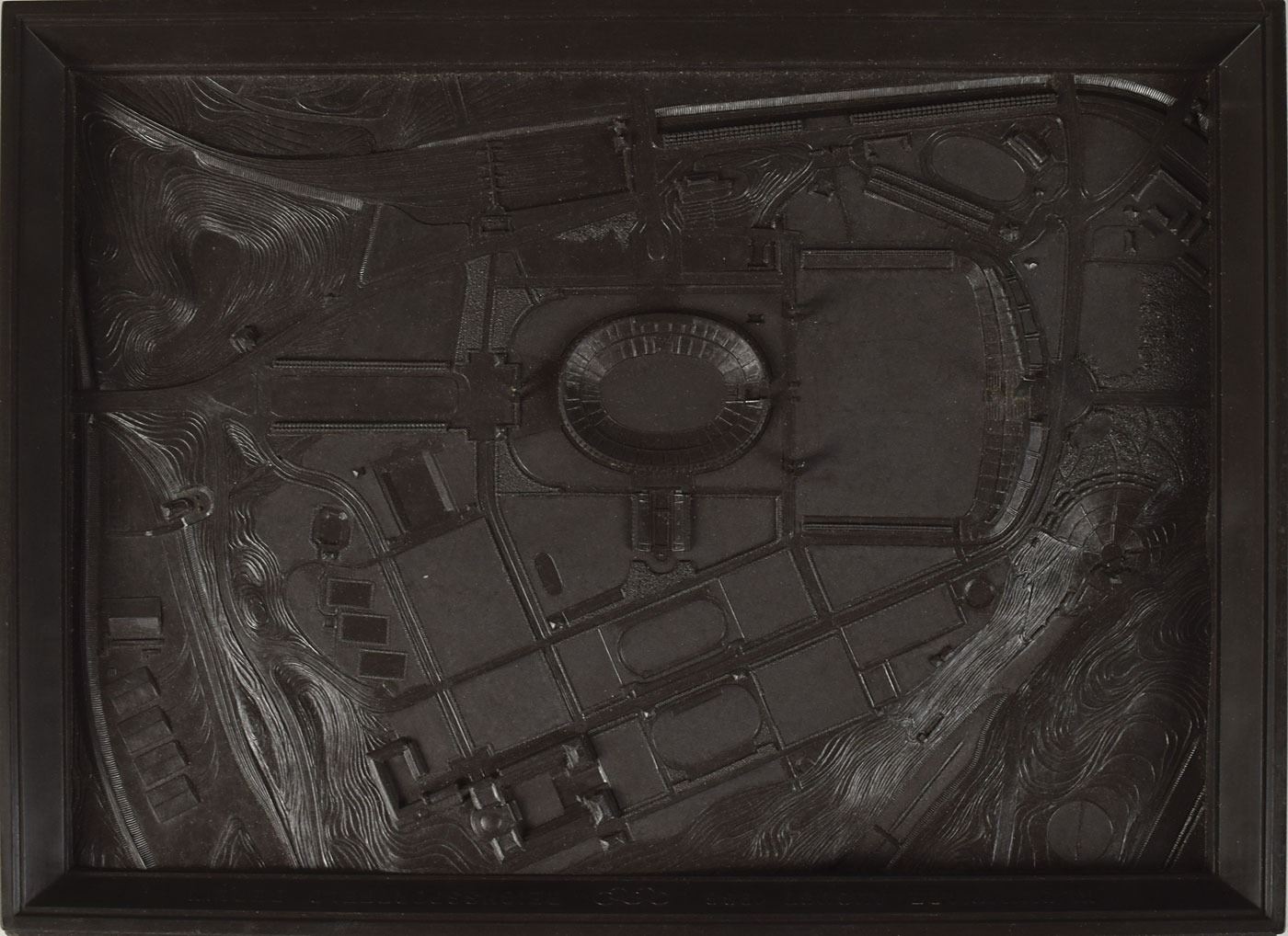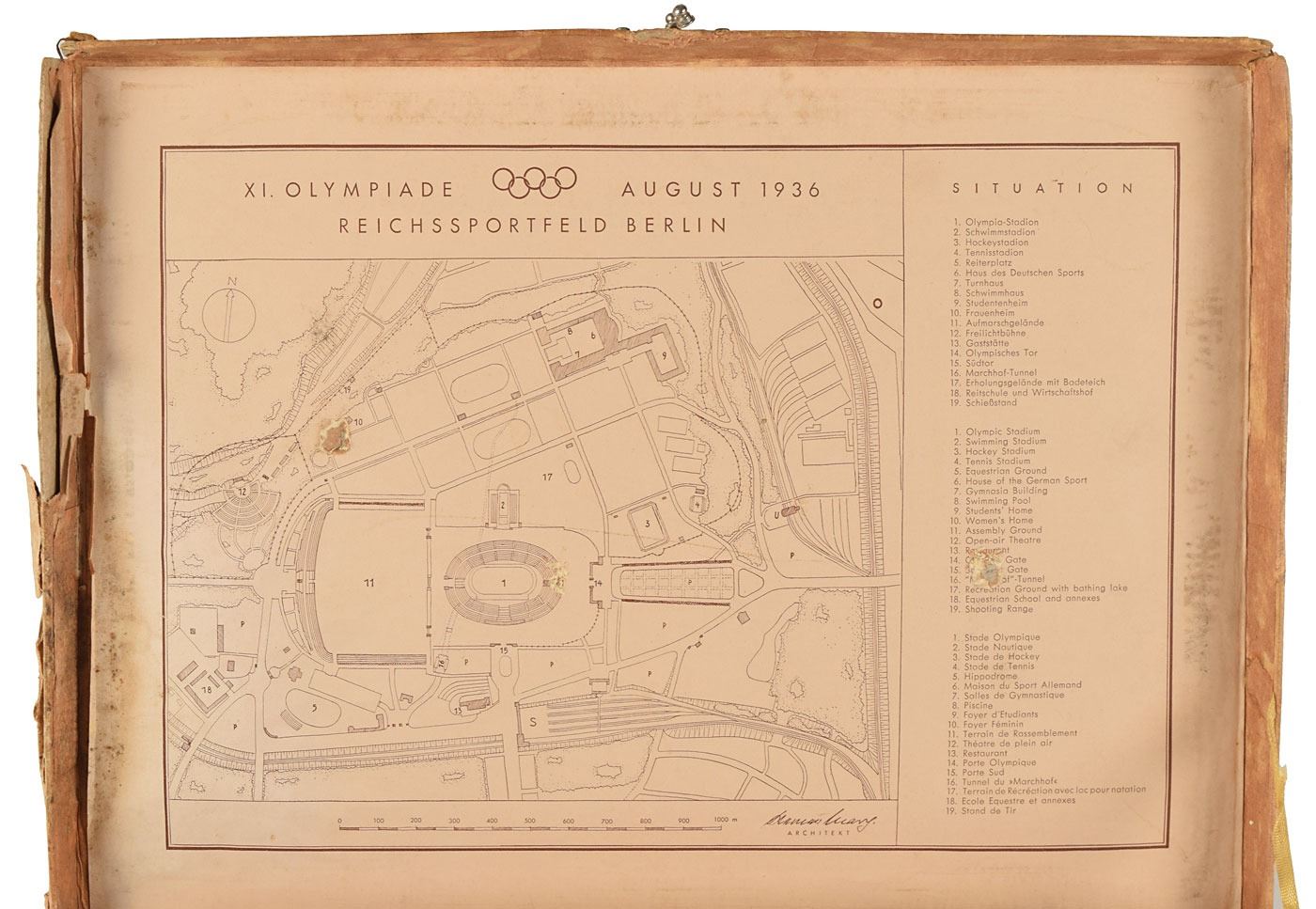 Original molded Bakelite topographical model of the Reichssportfeld, the Grunewald sporting complex constructed for the Berlin 1936 Olympic Summer Olympics. The model measures 11.75 x 8.5 x 1 and depicts the sprawling Reichssportfeld grounds and its surroundings; the entirety of the model is set within a raised frame with upper border reading: "XI. Olympiade August 1936 [Olympics Rings] Reichssportfeld Berlin." The model includes its original box, with the inside lid bearing a detailed map of the Reichssportfeld with numbers referencing German, English, and French directories to the right side; these numbers indicate Olympic sites such as the Olympic Stadium, the swimming, hockey, and tennis stadiums, the equestrian grounds, House of the German Sport, swimming pool, the Dietrich Eckart open-air stage, the Olympic Gate, shooting range, and other notable locations. The model is based on the designs of Master Architect Werner March of Berlin, as modeled by Oskar Reich of Berlin, and was manufactured by Berlin's Presswerk of Siemens-Schuckertwerke and sold by Sport-Lüder of Berlin-Spandau. In fine condition, with notable wear to case and map. A particularly uncommon piece of Third Reich Olympic memorabilia.