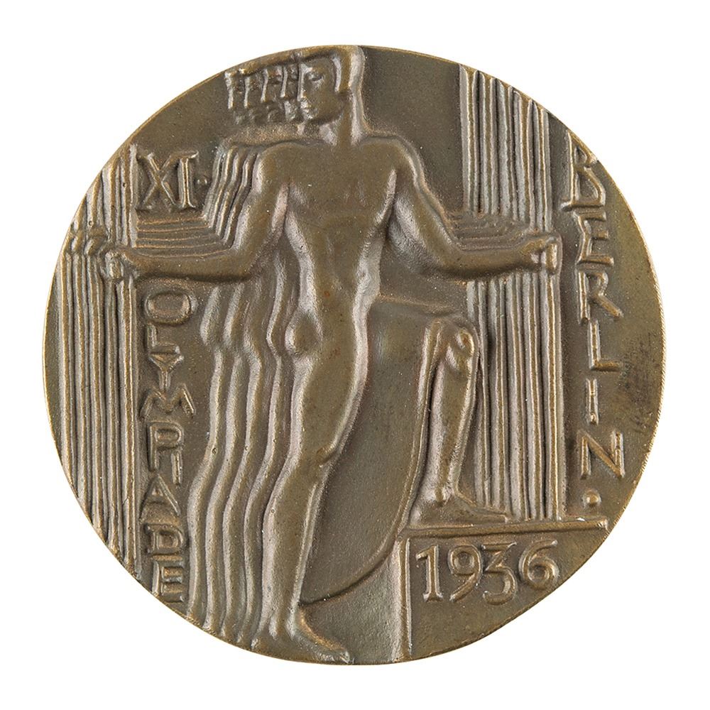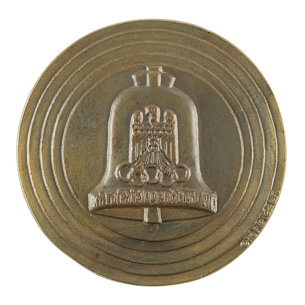 Participation medal issued for the Berlin 1936 Summer Olympics. Green brown bronze, 70 mm, 108 gm, by Otto Placzek. The front depicts five athletes, representing the five continents, pulling the ropes of the Olympic bell, with raised text, "XI Olympiade, Berlin, 1936"; the reverse bears the Olympic bell embossed with the German eagle gripping the Olympic rings within five concentric circles, the name of the designer on the outer edge.