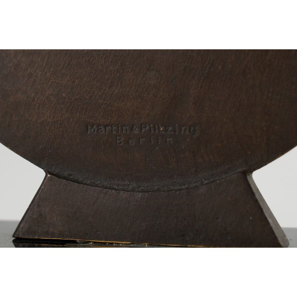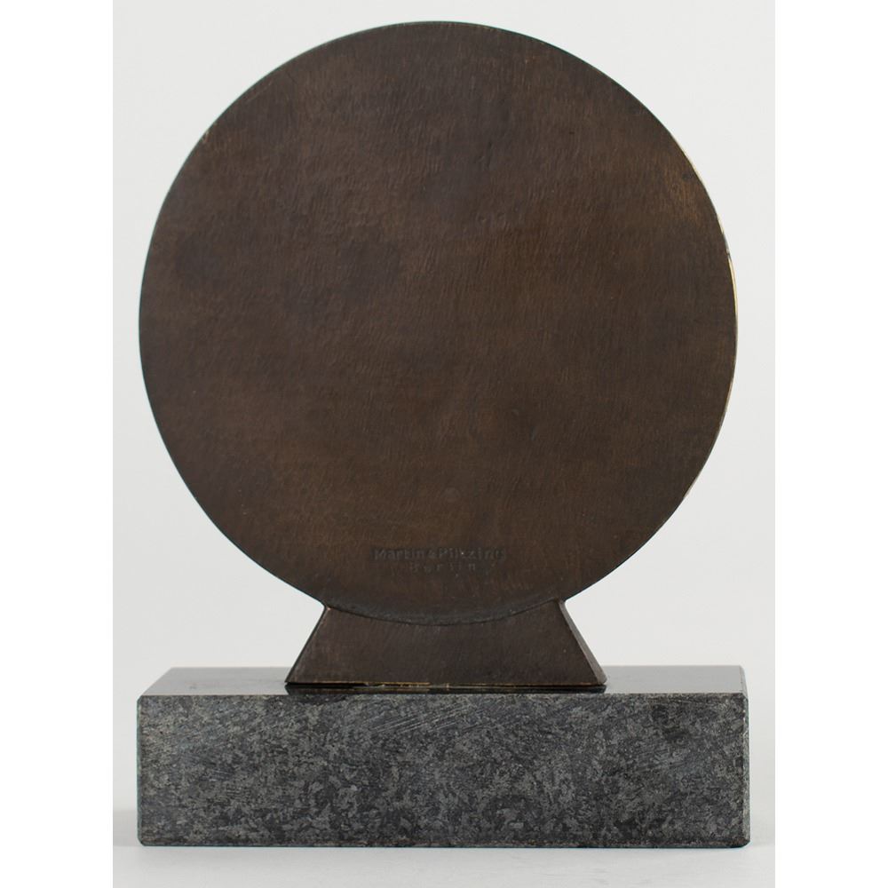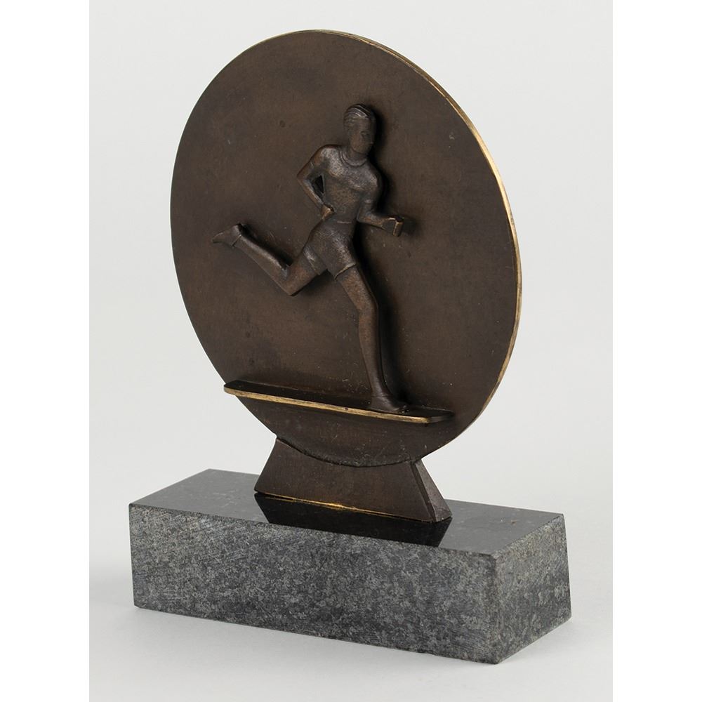 Circular commemorative bronze statue of a runner set on a black marble base, measuring an overall 4.75Ë x 6.5Ë x 1.5Ë, created by Martin & Piltzing, Berlin, as a souvenir for the Berlin 1936 Summer Olympics. Reverse of the disc bears the maker's mark of the famous Berlin foundry.