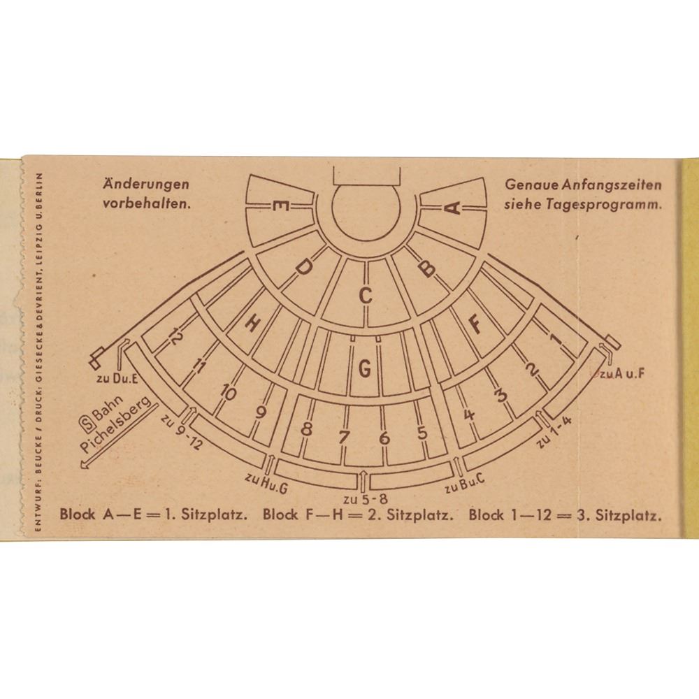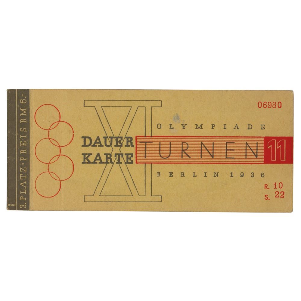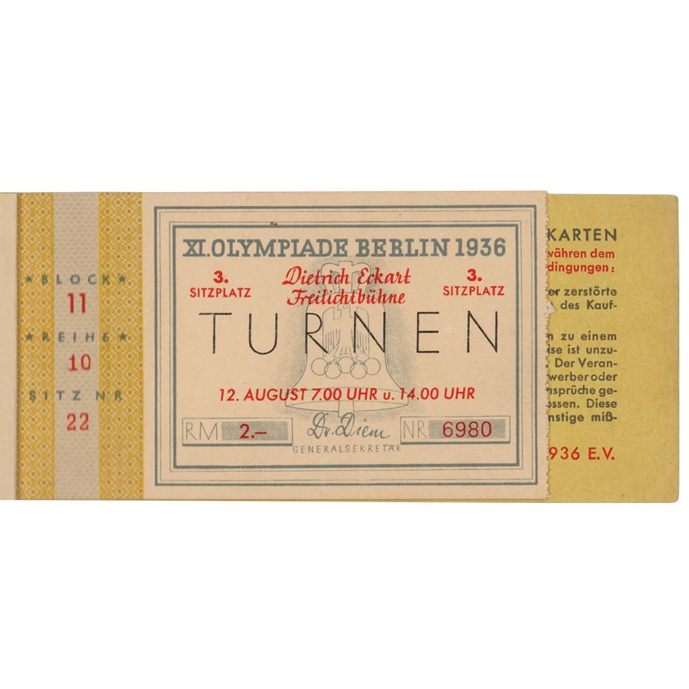 Ticket booklet with an attached ticket stub for a gymnastics event held on August 12th as part of the Berlin 1936 Summer Olympics. The booklet, numbered “06980,†measures 5.5 x 2.5, and contains a 4 x 2.5 ticket stub for a gymnastics event, issued for Block 11, Row 10, and Seat Number 22.†The reverse of the ticket features an overhead seating view of the Dietrich Eckart Open-Air Theatre. In fine condition.