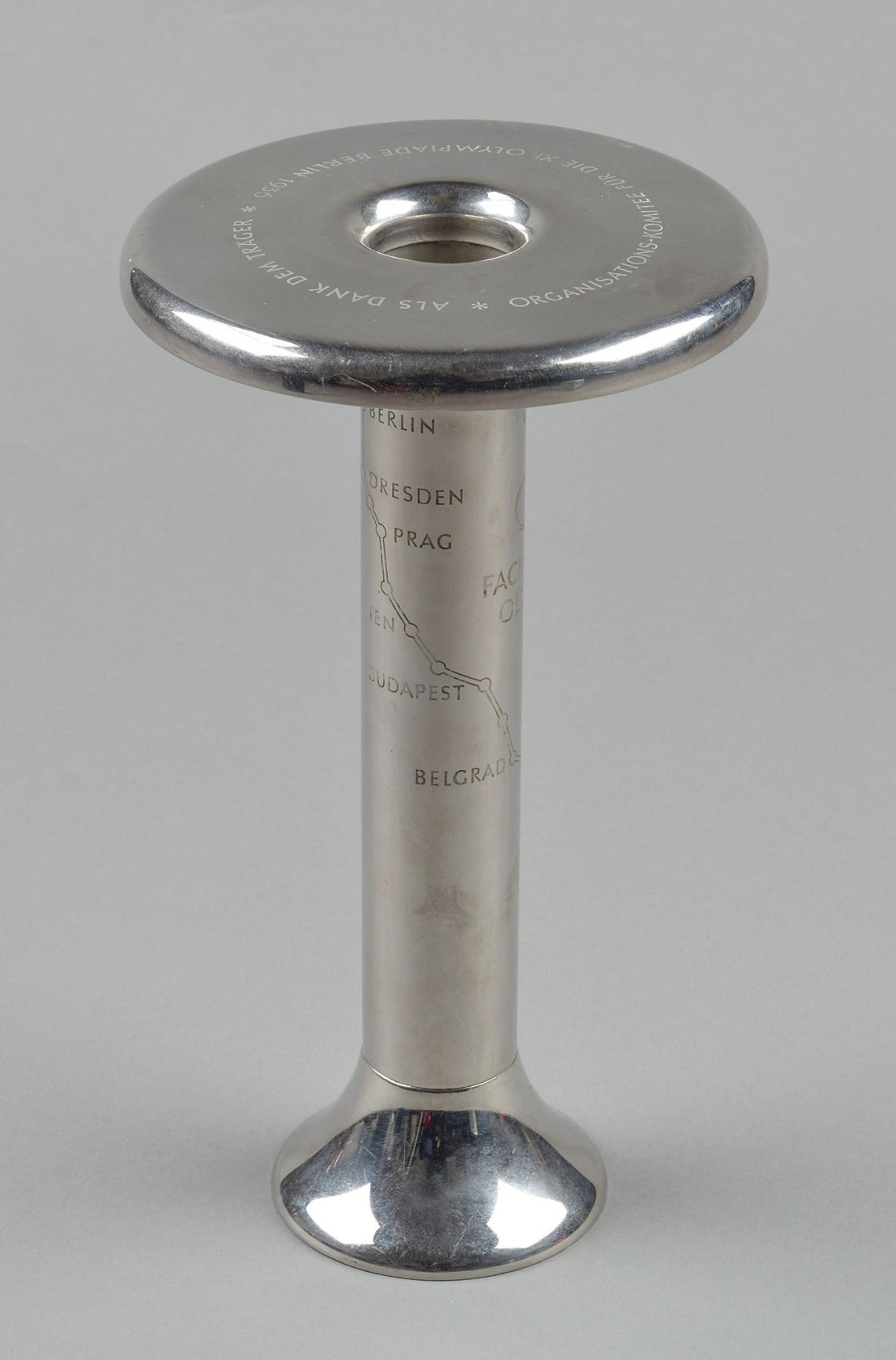 Official 1936 Berlin Olympics torch, comprised of steel, measuring 10.5? in length and 6? at its widest point, manufactured by Krupp. Engraved on the handle with a map of the torch relay route, the Olympic emblem, and inscribed, "Fackel-Staffel, Lauf, Olympia-Berlin, 1936." The top of the torch is inscribed, "Organisations-Komitee fur die XI. Olympiade Berlin 1936, Als Dank Dem Trager." The underside of the torch top is inscribed, "Stiftung Der Fried Krupp A. G. Essen, Krupp Nirosta V2A Stahl." Some mild scattered scratches to top platform and handle. The 1936 Summer Olympics torch relay was the first of its kind, transporting the Olympic flame from Olympia in Greece to the site of the Games in Berlin. Krupp produced a total of 3,840 torches, and 3,331 torchbearers participated in the relay. In total, it covered 3,187 km over twelve days. Representing the historically important 1936 Berlin Olympics as well as the establishment of the torch relay tradition, this is an iconic Olympic torch.