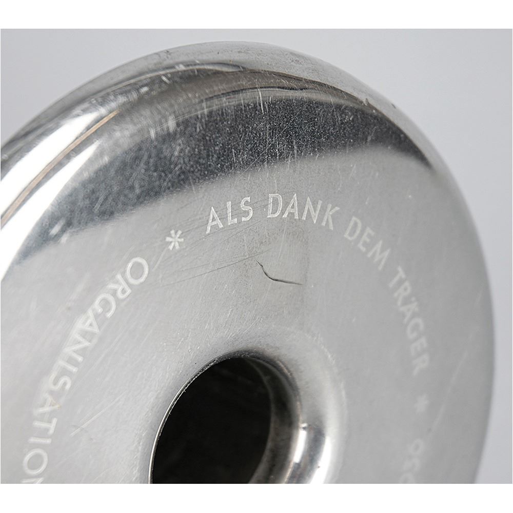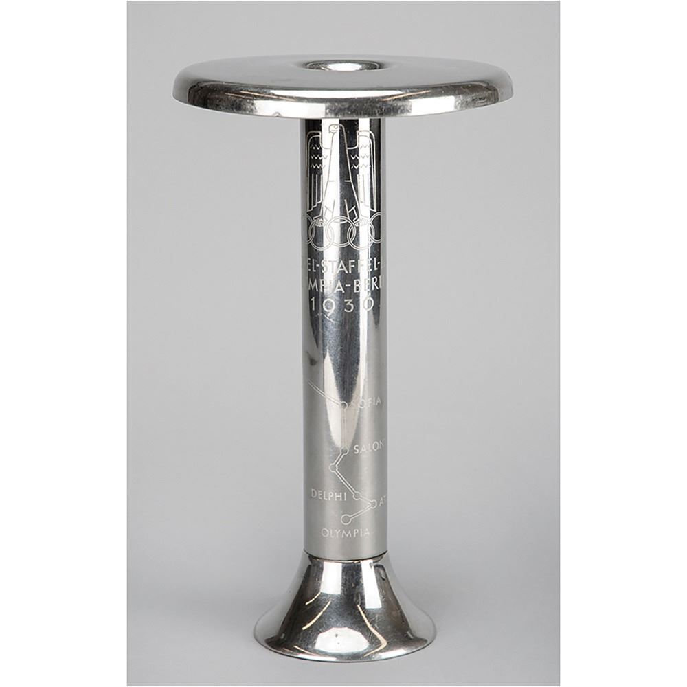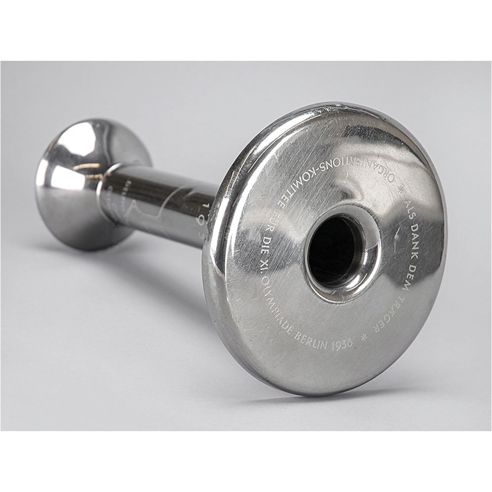 Official 1936 Berlin Olympics torch, comprised of steel, measuring 10.5Ë in length and 6Ë at its widest point, manufactured by Krupp. Engraved on the handle with a map of the torch relay route, the Olympic emblem, and inscribed, "Fackel-Staffel, Lauf, Olympia-Berlin, 1936." The top of the torch is inscribed, "Organisations-Komitee fur die XI. Olympiade Berlin 1936, Als Dank Dem Trager." The underside of the torch platform is inscribed, "Stiftung Der Fried Krupp A. G. Essen, Krupp Nirosta V2A Stahl." The torch bears scattered scratches, a ding to handle, and a small score to platform. The 1936 Summer Olympics torch relay was the first of its kind, transporting the Olympic flame from Olympia in Greece to the site of the Games in Berlin. Krupp produced a total of 3,840 torches, and 3,331 torchbearers participated in the relay. In total, it covered 3,187 km over twelve days. Representing the historically important 1936 Berlin Olympics as well as the establishment of the torch relay tradition, this is an iconic Olympic torch.