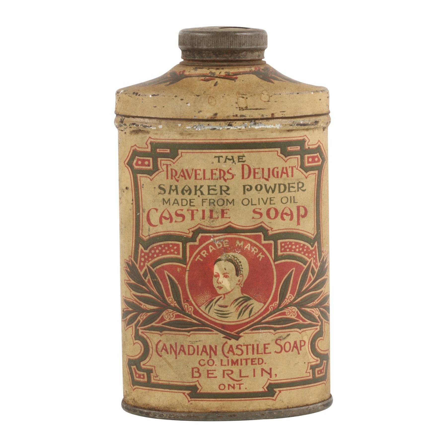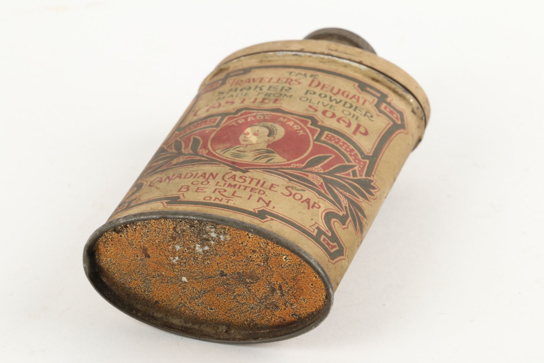 Canadian. Circa 1905. Lithographed tin. Rare. Marked, "Macdonald Mfg Co. Ltd, Toronto" lower edge. 4.5" x 2.5" x 1.25". Minor edge flakes and generalized soil. Retains original closure. $100-200.
