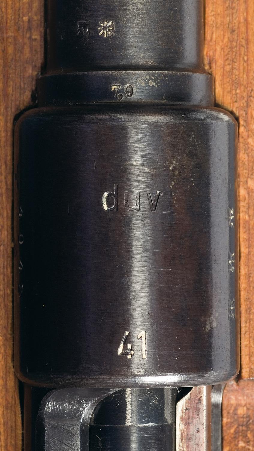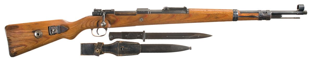 Hooded blade front and tangent rear sights, with "eagle/214" proofs on the barrel and receiver ring, and "duv/ 41" on the ring. Milled components, with blank front band, "9971" marked rear band and other parts matching. Smooth stock, with Heer stamp and a flat buttplate. With a crosshatched brown leather sling and a "39" dated Weyersburg (Solingen) bayonet with 10" blade, matching numbered sheath and leather frog. The "duv" code was only used for K98 production in 1941 and 1942, making it a hard to find a good example.